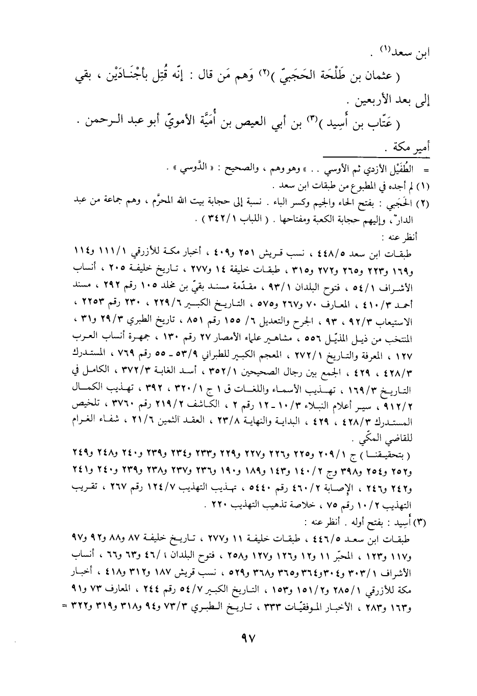 طبقات ابن سعد 5/ 448، نسب قريش 251 و 409، أخبار مكة للأزرقي 1/ 111 و 114 و 169 و 223 و 265 و 272 و 315، طبقات خليفة 14 و 277، تاريخ خليفة 205، أنساب الأشراف 1/ 54، فتوح البلدان 1/ 93، مقدّمة مسند بقيّ بن مخلد 105 رقم 292، مسند أحمد 3/ 410، المعارف 70 و 267 و 575، التاريخ الكبير 6/ 229، 230 رقم 2253، الاستيعاب 3/ 92، 93، الجرح والتعديل 6/ 155 رقم 851، تاريخ الطبري 3/ 2 و 31، المنتخب من ذيل المذيّل 556، مشاهير علماء الأمصار 27 رقم 130، جمهرة أنساب العرب 127، المعرفة والتاريخ 1/ 272، المعجم الكبير للطبراني 9/ 53- 55 رقم 769، المستدرك 3/ 428، 429، الجمع بين رجال الصحيحين 1/ 352، أسد الغابة 3/ 372، الكامل في التاريخ 3/ 169، تهذيب الأسماء واللغات ق 1/ ج 1/ 320، 392، تهذيب الكمال 2/ 912، سير أعلام النبلاء 3/ 10- 12 رقم 2، الكاشف 2/ 219 رقم 3760، تلخيص المستدرك 3/ 428، 429، البداية والنهاية 8/ 23، العقد الثمين 6/ 21، شفاء الغرام للقاضي المكّي.