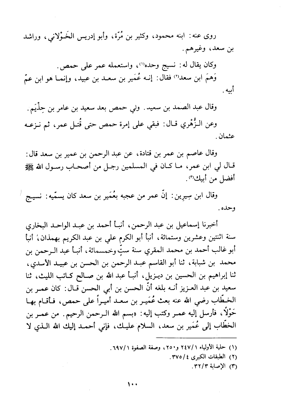 أَخْبَرَنَا إِسْمَاعِيلُ بْنُ عَبْدِ الرَّحْمَنِ، أَنْبَأَ أَحْمَدُ بْنُ عَبْدِ الْوَاحِدِ الْبُخَارِيُّ سَنَةَ اثْنَتَيْنِ وَعِشْرِينَ وَسِتِّمِائَةٍ، أَنْبَأَ أَبُو الْكَرَمِ عَلَيُّ بْنُ عَبْدِ الْكَرِيمِ بِهَمَذَانَ، أَنْبَأَ أَبُو غَالِبٍ أَحْمَدُ بْنُ مُحَمَّدٍ الْمُقْرِيُّ سَنَةَ سِتٍّ وَخَمْسِمِائَةٍ، أَنْبَأَ عَبْدُ الرَّحْمَنِ بْنُ مُحَمَّدِ بْنِ شَبَابَةَ، ثَنَا أَبُو الْقَاسِمِ عَبْدُ الرَّحْمَنِ بْنُ الْحَسَنِ بْنِ عُبَيْدٍ الْأَسَدِيُّ، ثَنَا إِبْرَاهِيمُ بْنُ الْحُسَيْنِ بْنِ دِيزِيلَ، أَنْبَأَ عَبْدُ اللَّهِ بْنُ صَالِحٍ كَاتِبُ اللَّيْثِ، ثَنَا سَعِيدُ بْنُ عَبْدِ الْعَزِيزِ أَنَّهُ بَلَغَهُ أَنَّ الْحَسَنَ بْنَ أَبِي الْحَسَنِ قَالَ: كَانَ عُمَرُ بْنُ الْخَطَّابِ رَضِيَ اللَّهُ عَنْهُ بَعَثَ عُمَيْرَ بْنَ سَعْدٍ أَمِيرًا عَلَى حِمْصَ، فَأَقَامَ بِهَا حَوْلًا، فَأَرْسَلَ إِلَيْهِ عُمَرُ وَكَتَبَ إِلَيْهِ: «بِسْمِ اللَّهِ الرَّحْمَنِ الرَّحِيمِ. مِنْ عُمَرَ بْنِ الْخَطَّابِ إِلَى عُمَيْرِ بْنِ سَعْدٍ، السَّلَامُ عَلَيْكَ، فَإِنِّي أَحْمَدُ إِلَيْكَ الله الّذي لا