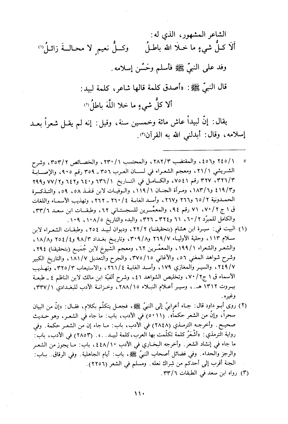 أَلَا كُلُّ شَيْءٍ مَا خَلَا اللَّهُ بَاطِلٌ وَكُلُّ نَعِيمٍ لَا مَحَالَةَ زَائِلٌ [1] وَفَدَ عَلَى النَّبِيِّ صَلَّى اللَّهُ عليه وآله وَسَلَّمَ فَأَسْلَمَ وَحَسُنَ إِسْلَامُهُ.