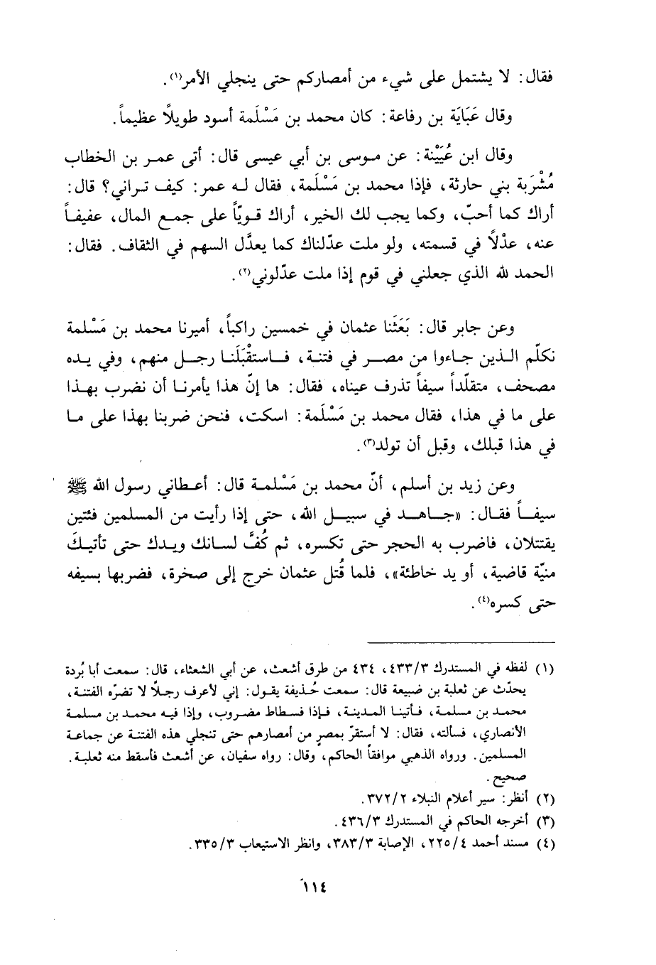 وَعَنْ زَيْدِ بْنِ أَسْلَمَ، أَنَّ مُحَمَّدَ بْنَ مَسْلَمَةَ قَالَ: أَعْطَانِي رَسُولُ الله صلى الله عليه وآله وَسَلَّمَ سَيْفًا فَقَالَ: «جَاهِدْ فِي سَبِيلِ اللَّهِ، حَتَّى إِذَا رَأَيْتَ مِنَ الْمُسْلِمِينَ فِئَتَيْنِ يَقْتَتِلَانِ، فَاضْرِبْ بِهِ الْحَجَرَ حَتَّى تَكْسِرَهُ، ثُمَّ كُفَّ لِسَانَكَ وَيَدَكَ حَتَّى تَأْتِيَكَ مَنِيَّةٌ قَاضِيَةٌ، أَوْ يَدٌ خَاطِئَةٌ» ، فَلَمَّا قُتِلَ عُثْمَانُ خَرَجَ إِلَى صخرة، فضربها بسيفه حتى كسره [4] .