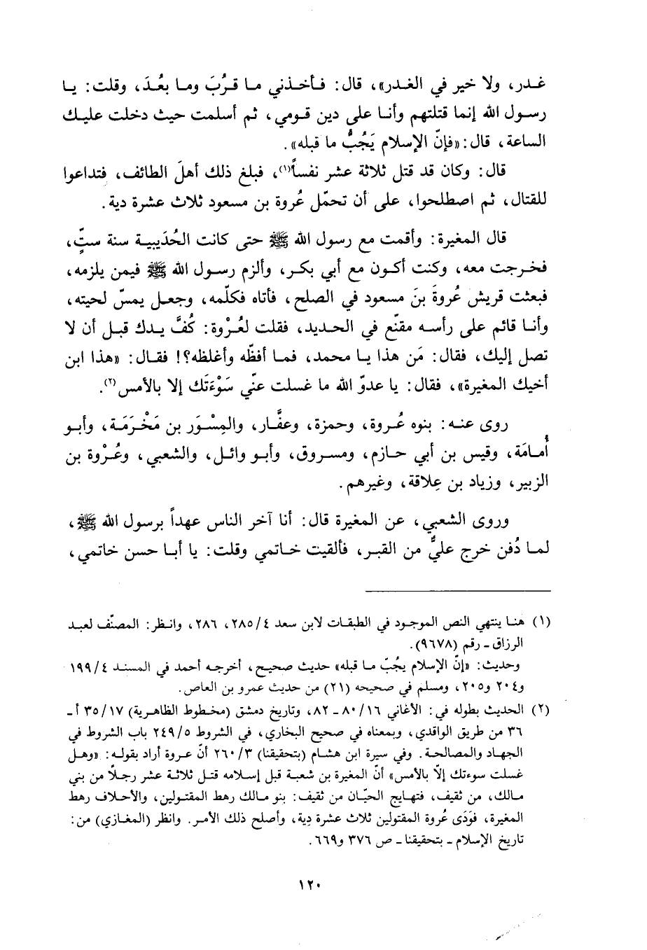 قَالَ الْمُغِيرَةُ: وَأَقَمْتُ مَعَ رَسُولِ اللَّهِ صلى الله عليه وآله وَسَلَّمَ حَتَّى كَانَتِ الْحُدَيْبِيَةُ سَنَةَ سِتٍّ، فَخَرَجْتُ مَعَهُ، وَكُنْتُ أَكُونُ مَعَ أَبِي بَكْرٍ، وَأَلْزَمُ رسول الله صلى الله عليه وآله وَسَلَّمَ فِيمَنْ يَلْزَمُهُ، فَبَعَثَتْ قُرَيْشٌ عُرْوَةَ بْنَ مَسْعُودٍ فِي الصُّلْحِ، فَأَتَاهُ فَكَلَّمَهُ، وَجَعَلَ يَمَسُّ لِحْيَتَهُ، وَأَنَا قَائِمٌ عَلَى رَأْسِهِ مُقَنَّعٌ فِي الْحَدِيدِ، فَقُلْتُ لِعُرْوَةَ: كُفَّ يَدَكَ قَبْلَ أَنْ لَا تَصِلَ إِلَيْكَ، فَقَالَ: مَنْ هَذَا يَا مُحَمَّدُ، فَمَا أَفَظَّهُ وَأَغْلَظَهُ؟! فَقَالَ: «هَذَا ابْنُ أَخِيكَ الْمُغِيرَةُ» ، فَقَالَ: يَا عَدُوَّ اللَّهِ مَا غَسَلْتُ عَنِّي سَوْأَتَكَ إِلَّا بِالْأَمْسِ [2] .