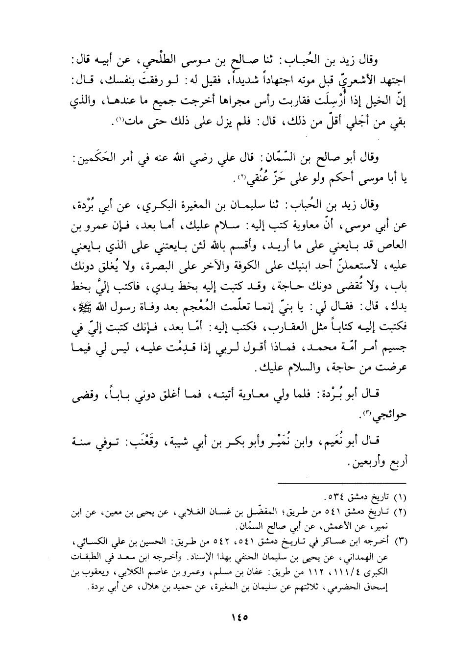 [3] أخرجه ابن عساكر في تاريخ دمشق 541، 542 من طريق: الحسين بن علي الكسائي، عن الهمدانيّ، عن يحيى بن سليمان الحنفي بهذا الإسناد. وأخرجه ابن سعد في الطبقات الكبرى 4/ 111، 112 من طريق: عفان بن مسلم، وعمرو بن عاصم الكلابي، ويعقوب بن إسحاق الحضرميّ، ثلاثتهم عن سليمان بن المغيرة، عن حميد بن هلال، عن أبي بردة.
