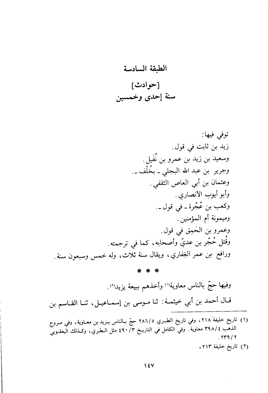 [1] تاريخ خليفة 218، وفي تاريخ الطبري 5/ 286 حجّ بالناس يزيد بن معاوية، وفي مروج الذهب 4/ 398 معاوية. وفي الكامل في التاريخ 3/ 490 مثل الطبري، وكذلك اليعقوبي 2/ 239.