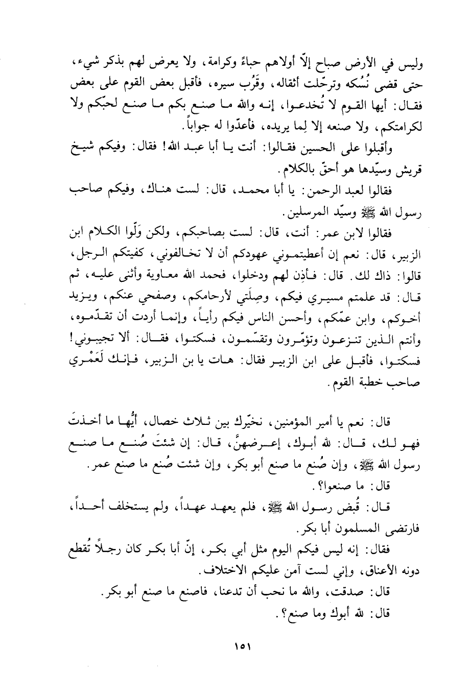 وأقبلَوْا عَلَى الحسين فقالْوَا: أنت يَا أبا عَبْد اللَّهِ! فَقَالَ: وفيكم شيخ قريش وسيدها هُوَ أحق بالكلام. فقالْوَا لعَبْد الرَّحْمَنِ: يَا أبا محمد، قَالَ: لست هناك، وفيكم صاحب رَسُول اللَّهِ صَلَّى الله عليه وآله وَسَلَّمَ وسيد المرسلين.