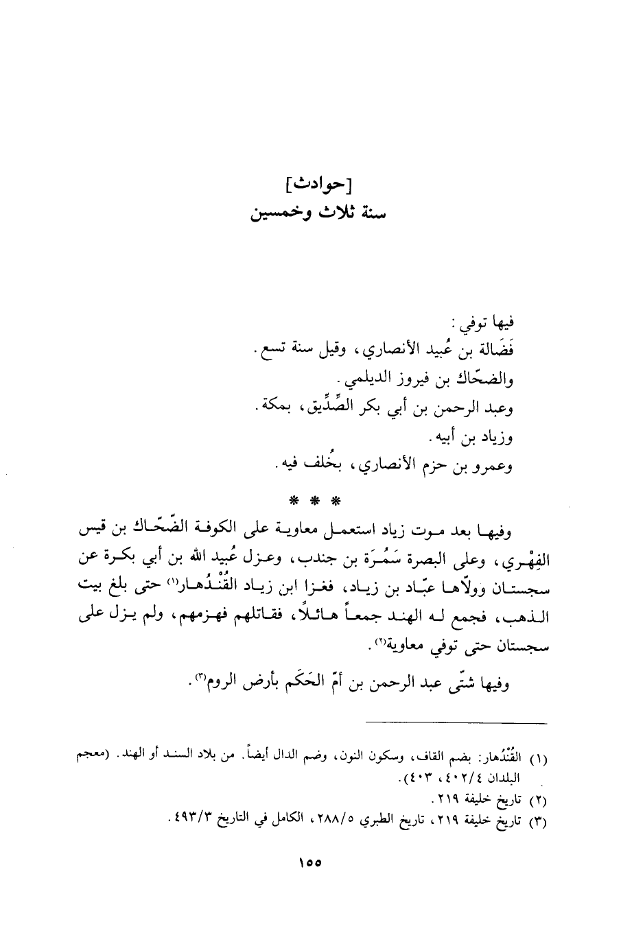 وَفِيهَا بَعْدَ موت زياد استعمل مُعَاوِيَة عَلَى الْكُوفَة الضحاك بن قيس الفِهْري، وعلى الْبَصْرَةِ سَمُرَة بن جندب، وعزل عُبيد اللَّه بْنَ أَبِي بَكْرَةَ عَن سِجِسْتَانَ وَوَلاهَا عباد بن زياد، فغزا ابن زياد القنُدُهار [1] حَتَّى بلغ بيت الذهب، فجمع لَهُ الهند جمعًا هائلًا، فقاتلهم فهزمهم، وَلَمْ يزل عَلَى سجستان حَتَّى تُوُفِّيَ مُعَاوِيَة [2] .