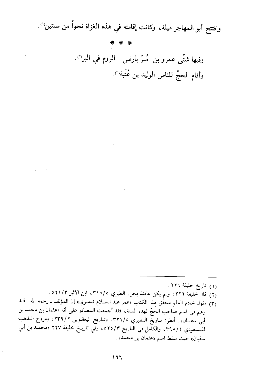 [3] بقول خادم العلم محقّق هذا الكتاب «عمر عبد السلام تدمري» إن المؤلف- رحمه الله- قد وهم في اسم صاحب الحجّ لهذه السنة، فقد أجمعت المصادر على أنه «عثمان بن محمد بن أبي سفيان» . انظر: تاريخ الطبري 5/ 321، وتاريخ اليعقوبي 2/ 239، ومروج الذهب للمسعوديّ 4/ 398، والكامل في التاريخ 3/ 525، وفي تاريخ خليفة 227 «محمد بن أبي سفيان» حيث سقط اسم «عثمان بن محمد» .