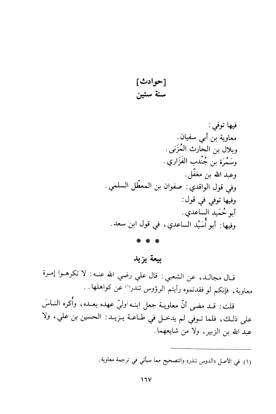بيعة يزيد قَالَ مُجَالِدٌ، عَنِ الشَّعْبِيِّ: قَالَ عَلِيٌّ رَضِيَ اللَّهُ عَنْهُ: لَا تَكْرَهُوا إمرة معاوية، فإنكم لو فقدتموه رأيتم الرءوس تَنْدُرُ [1] عَنْ كَوَاهِلِهَا. قلت: قَدْ مضى أن مُعَاوِيَة جعل ابنه وَليّ عهده بَعْدَه، وأكره النَّاسَ عَلَى ذلك، فلما تُوُفِّيَ لَمْ يَدْخُلْ في طاعة يزيد: الحسين بن عَلِيّ، وَلَا عَبْد اللَّهِ بن الزبير، وَلَا من شايعهما.