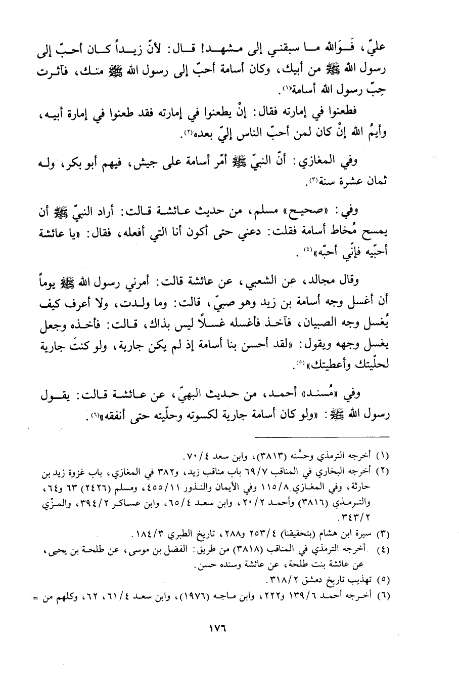 عليّ، فو الله مَا سَبَقَنِي إِلَى مَشْهَدٍ! قَالَ: لِأَنَّ زَيْدًا كَانَ أَحَبَّ إِلَى رَسُولِ اللَّهِ صَلَّى اللَّهُ عليه وآله وَسَلَّمَ مِنْ أَبِيكَ، وَكَانَ أُسَامَةُ أَحَبَّ إِلَى رَسُولِ اللَّهِ صَلَّى اللَّهُ عَلَيْهِ وآله وَسَلَّمَ مِنْكَ، فَآثَرْتُ حِبَّ رَسُولِ اللَّهِ أُسَامَةَ [1] .