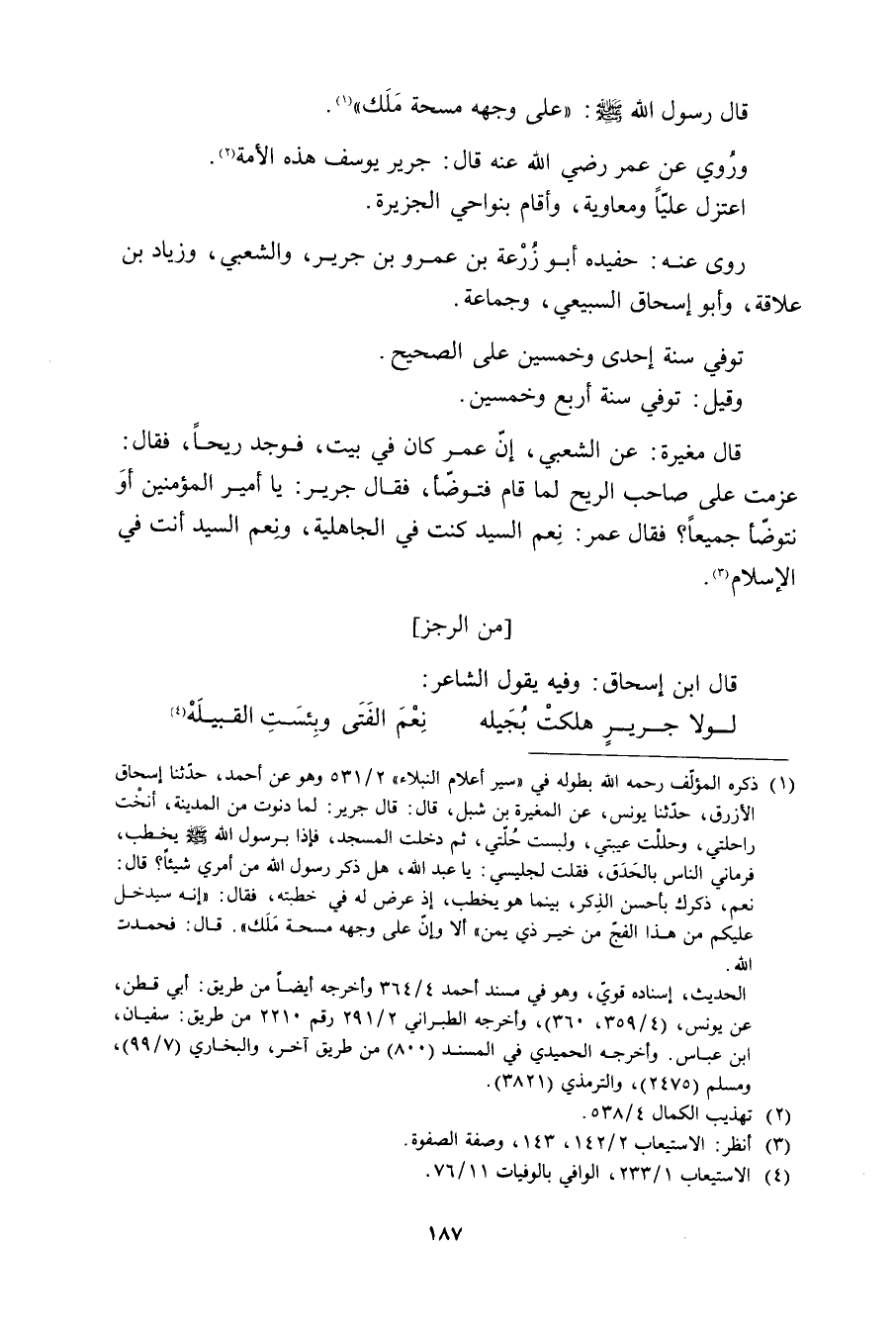 [1] ذكره المؤلّف رحمه الله بطوله في «سير أعلام النبلاء» 2/ 531 وهو عن أحمد، حدّثنا إسحاق الأزرق، حدّثنا يونس، عن المغيرة بن شبل، قال: قال جرير: لما دنوت من المدينة، أنخت راحلتي، وحللت عيبتي، ولبست حلّتي، ثم دخلت المسجد، فإذا برسول الله صلى الله عليه وآله وَسَلَّمَ يَخْطُبُ، فَرَمَانِي النَّاسُ بِالْحَدَقِ، فَقُلْتُ لِجَلِيسِي: يا عبد الله، هل ذكر رسول الله مِنْ أَمْرِي شَيْئًا؟ قَالَ:
