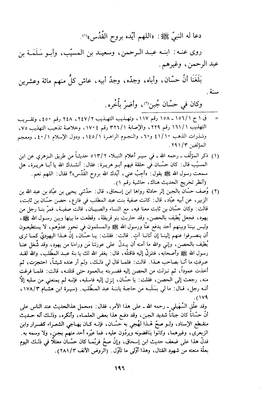 [1] ذكر المؤلّف- رحمه الله- في سير أعلام النبلاء 2/ 513 حديثا من طريق الزهري عن ابن المسيّب قال: كان حسّان في حلقة فيهم أبو هريرة: فقال: أنشدك الله يا أبا هريرة، هل سمعت رسول الله صلى الله عليه وآله وسلم يقول: «أجب عني، أيّدك الله بروح القدس» ؟ فقال: اللَّهمّ نعم. (انظر تخريج الحديث هناك، حاشية رقم 1) .