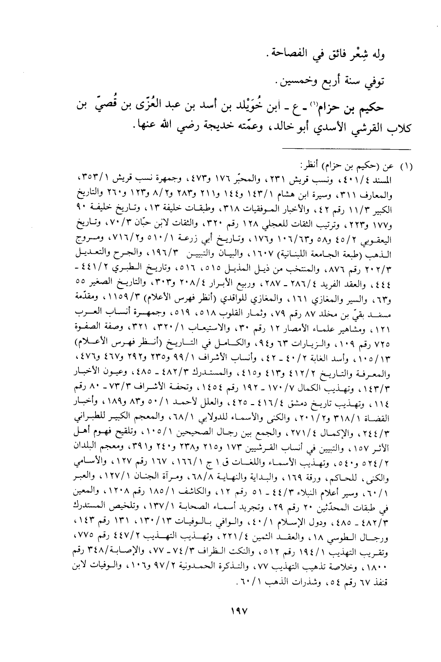 حكيم بن حزام [1]- ع- ابن خُوَيْلِدِ بْنِ أَسَدِ بْنِ عَبْدِ الْعُزَّى بْنِ قُصي بن كلاب القرشي الأسدي أَبُو خالد، وعمّته خديجة رضي الله عنها.