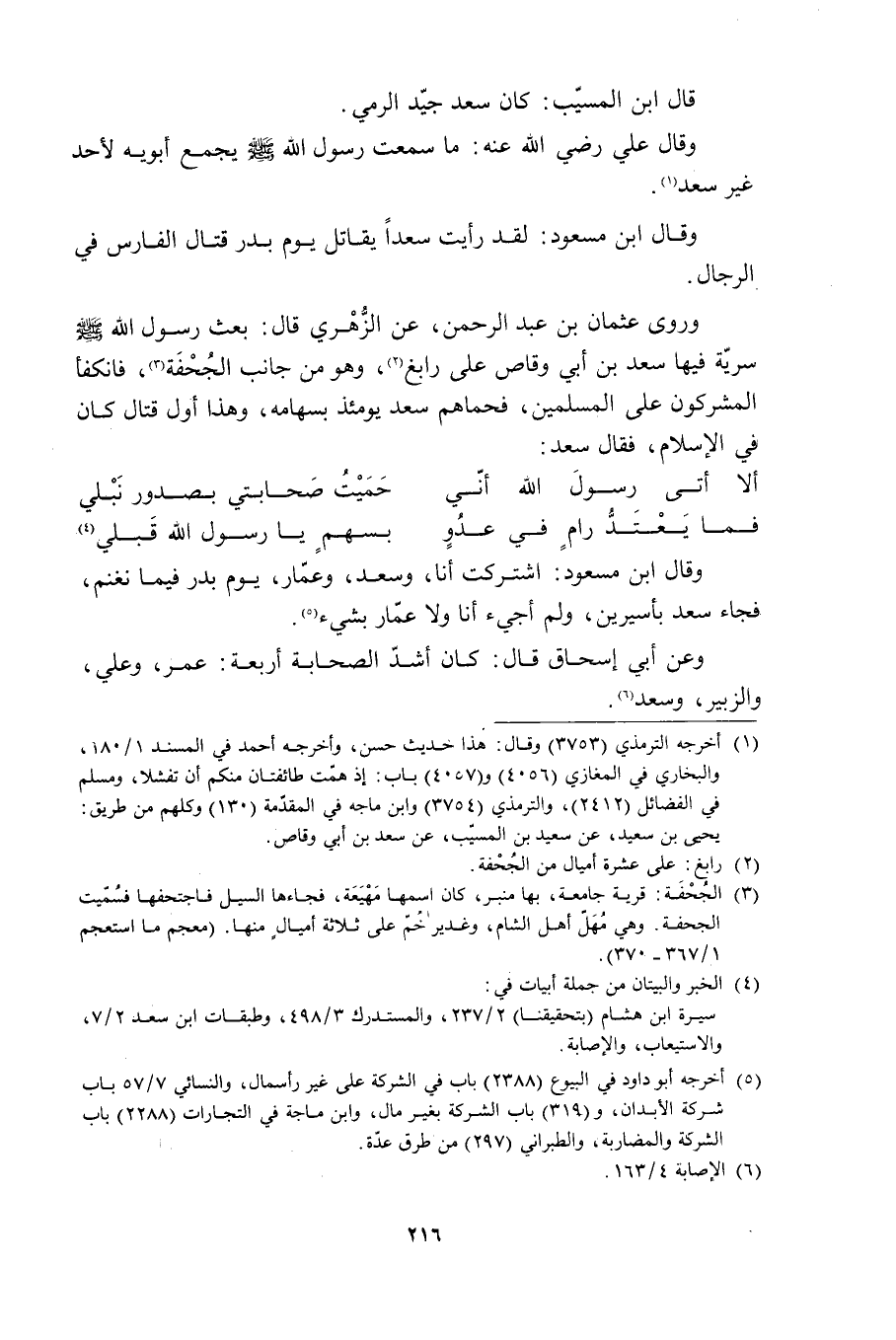 وَقَالَ عَلَى رَضِيَ اللَّهُ عَنْهُ: مَا سمعت رسول الله صلى الله عليه وآله وَسَلَّمَ يجمع أَبويه لأحد غير سعد [1] .