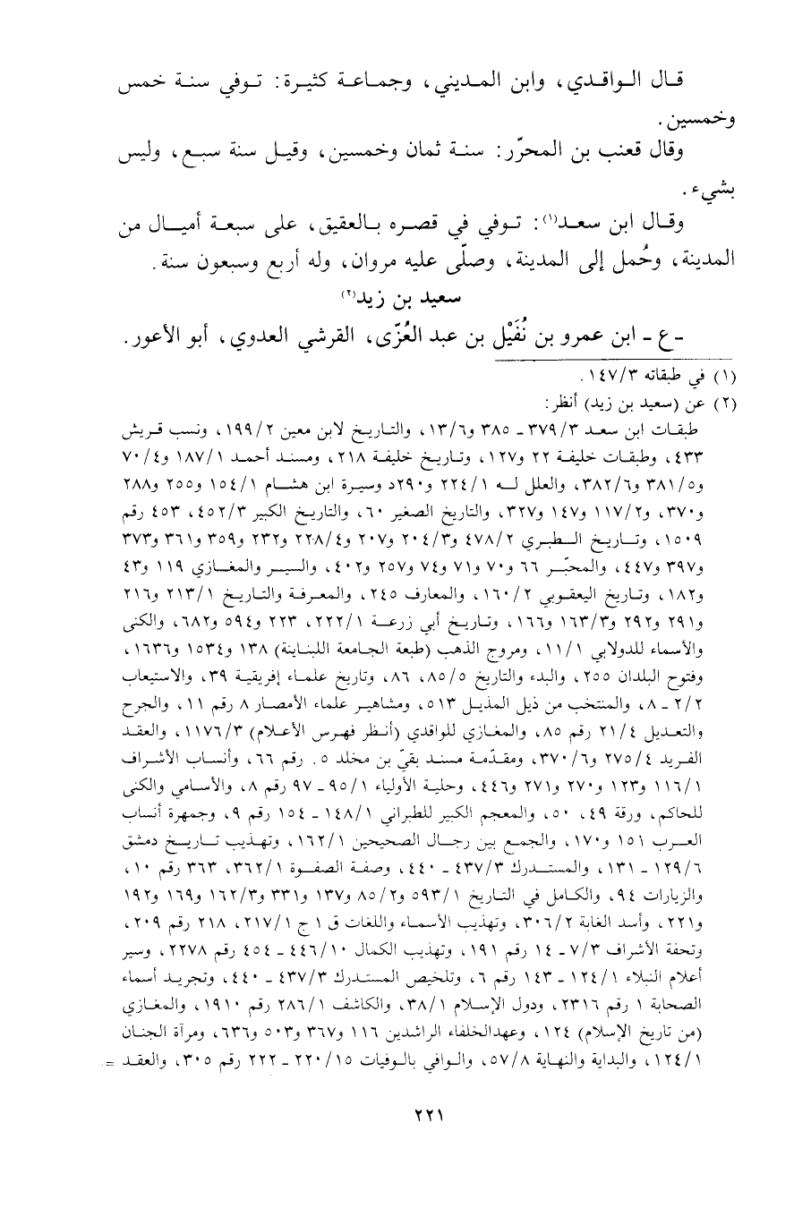 طبقات ابن سعد 3/ 379- 385 و 6/ 13، والتاريخ لابن معين 2/ 199، ونسب قريش 433، وطبقات خليفة 22 و 127، وتاريخ خليفة 218، ومسند أحمد 1/ 187 و 4/ 70 و 5/ 381 و 6/ 382، والعلل له 1/ 224 و 290 د وسيرة ابن هشام 1/ 154 و 255 و 288 و 370، و 2/ 117 و 147 و 327، والتاريخ الصغير 60، والتاريخ الكبير 3/ 452، 453 رقم 1509، وتاريخ الطبري 2/ 478 و 3/ 204 و 207 و 4/ 228 و 232 و 359 و 361 و 373 و 397 و 447، والمحبّر 66 و 70 و 71 و 74 و 257 و 402، والسير والمغازي 119 و 43 و 182، وتاريخ اليعقوبي 2/ 160، والمعارف 245، والمعرفة والتاريخ 1/ 213 و 216 و 291 و 292 و 3/ 163 و 166، وتاريخ أبي زرعة 1/ 222، 223 و 594 و 682، والكنى والأسماء للدولابي 1/ 11، ومروج الذهب (طبعة الجامعة اللبنانية) 138 و 1534 و 1636، وفتوح البلدان 255، والبدء والتاريخ 5/ 85، 86، وتاريخ علماء إفريقية 39، والاستيعاب 2/ 2- 8، والمنتخب من ذيل المذيل 513، ومشاهير علماء الأمصار 8 رقم 11، والجرح والتعديل 4/ 21 رقم 85، والمغازي للواقدي (انظر فهرس الأعلام) 3/ 1176، والعقد الفريد 4/ 275 و 6/ 370، ومقدّمة مسند بقيّ بن مخلد 5. رقم 66، وأنساب الأشراف 1/ 116 و 123 و 270 و 271 و 446، وحلية الأولياء 1/ 95- 97 رقم 8، والأسامي والكنى للحاكم، ورقة 49، 50، والمعجم الكبير للطبراني 1/ 148- 154 رقم 9، وجمهرة أنساب العرب 151 و 170، والجمع بين رجال الصحيحين 1/ 162، وتهذيب تاريخ دمشق 6/ 129- 131، والمستدرك 3/ 437- 440، وصفة الصفوة 1/ 362، 363 رقم 10، والزيارات 94، والكامل في التاريخ 1/ 593 و 2/ 85 و 137 و 331 و 3/ 162 و 169 و 192 و 221، وأسد الغابة 2/ 306، وتهذيب الأسماء واللغات ق 1 ج 1/ 217، 218 رقم 209، وتحفة الأشراف 3/ 7- 14 رقم 191، وتهذيب الكمال 10/ 446- 454 رقم 2278، وسير أعلام النبلاء 1/ 124- 143 رقم 6، وتلخيص المستدرك 3/ 437- 440، وتجريد أسماء الصحابة 1 رقم 2316، ودول الإسلام 1/ 38، والكاشف 1/ 286 رقم 1910، والمغازي (من تاريخ الإسلام) 124، وعهد الخلفاء الراشدين 116 و 367 و 503 و 636، ومرآة الجنان 1/ 124، والبداية والنهاية 8/ 57، والوافي بالوفيات 15/ 220- 222 رقم 305، والعقد