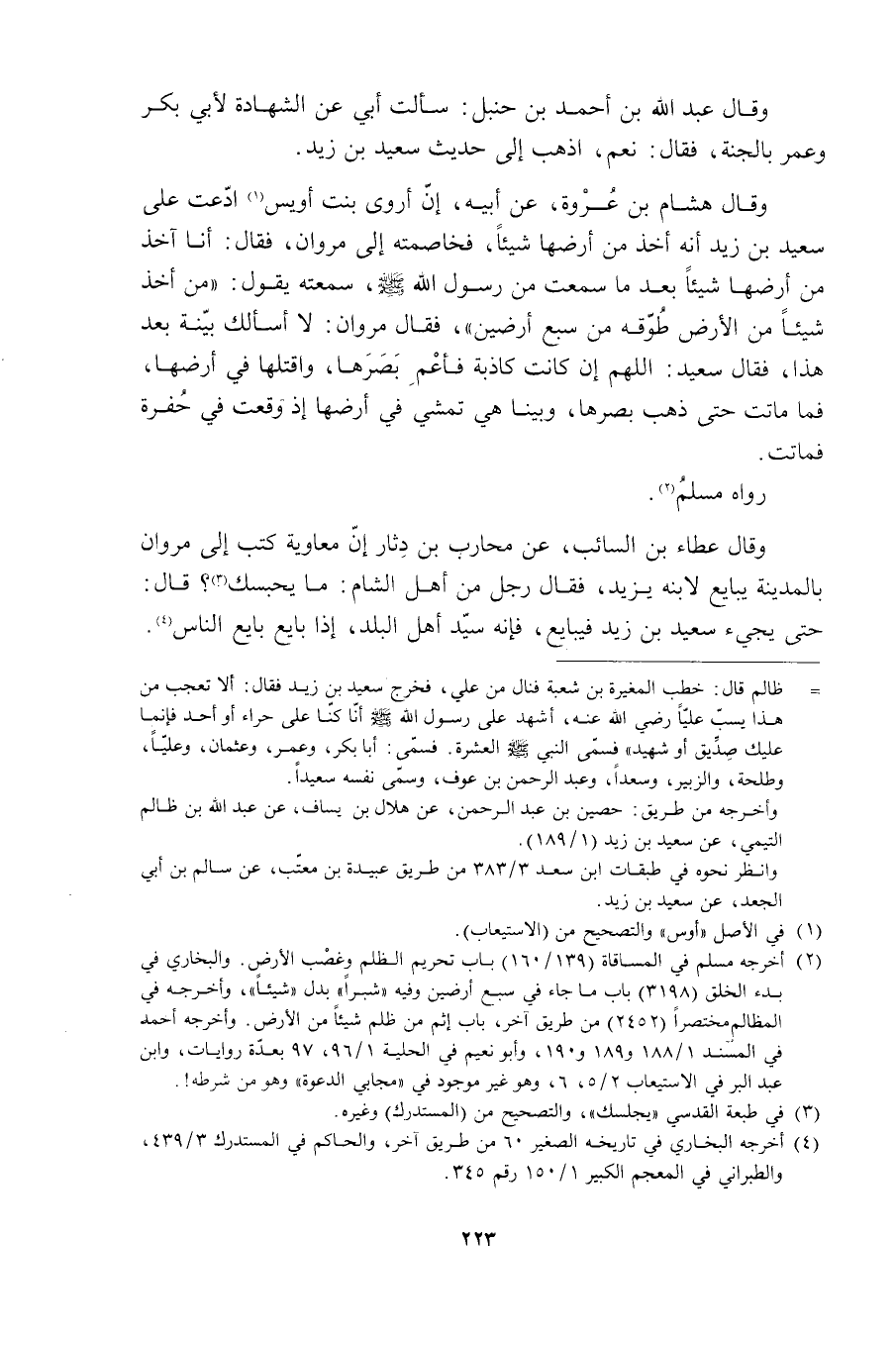 [2] أخرجه مسلم في المساقاة (139/ 160) باب تحريم الظلم وغصب الأرض. والبخاري في بدء الخلق (3198) باب ما جاء في سبع أرضين وفيه «شبرا» بدل «شيئا» ، وأخرجه في المظالم مختصرا (2452) من طريق آخر، باب إثم من ظلم شيئا من الأرض. وأخرجه أحمد في المسند 1/ 188 و 189 و 190، وأبو نعيم في الحلية 1/ 96، 97 بعدّة روايات، وابن عبد البر في الاستيعاب 2/ 5، 6، وهو غير موجود في «مجابي الدعوة» وهو من شرطه!.