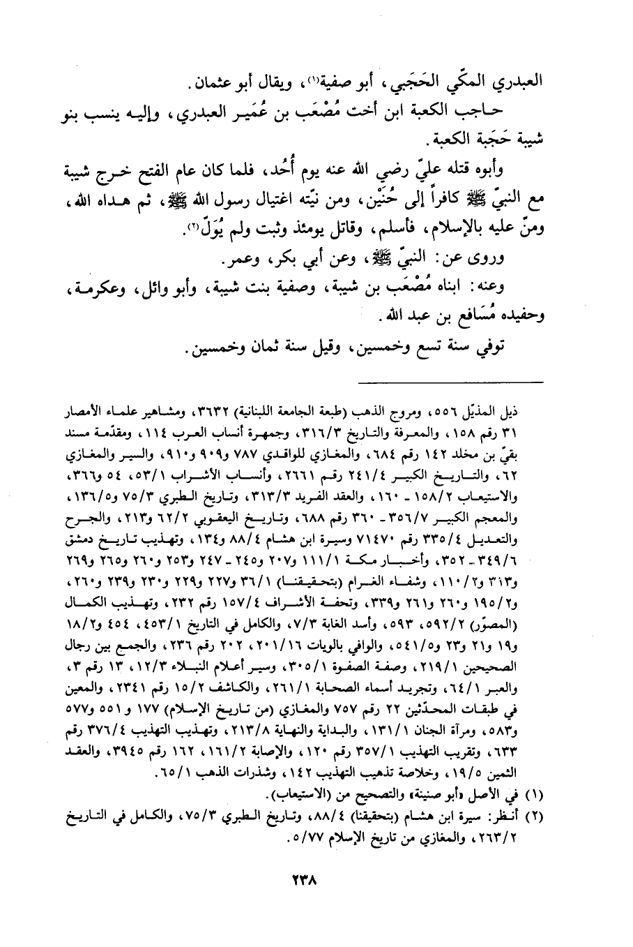 حاجب الكعبة ابن أخت مُصْعَب بن عُمَير العَبْدري، وإليه ينسب بنو شيبة حَجَبة الكعبة.