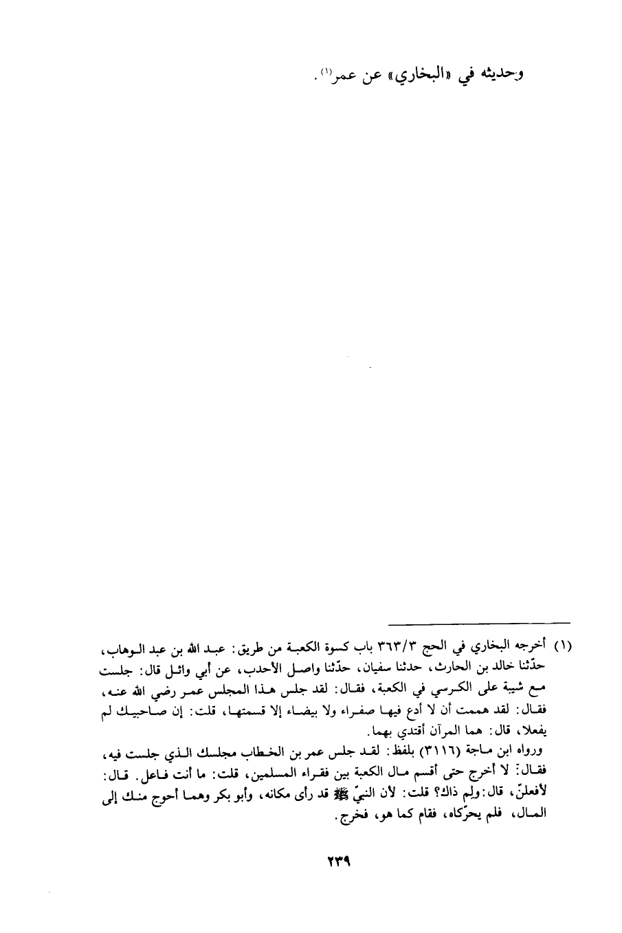 [1] أخرجه البخاري في الحج 3/ 363 باب كسوة الكعبة من طريق: عبد الله بن عبد الوهاب، حدّثنا خالد بن الحارث، حدثنا سفيان، حدّثنا واصل الأحدب، عن أبي وائل قال: جلست مع شيبة على الكرسي في الكعبة، فقال: لقد جلس هذا المجلس عمر رضي الله عنه، فقال: لقد هممت أن لا أدع فيها صفراء ولا بيضاء إلا قسمتها، قلت: إن صاحبيك لم يفعلا، قال: هما المرءان أقتدي بهما.