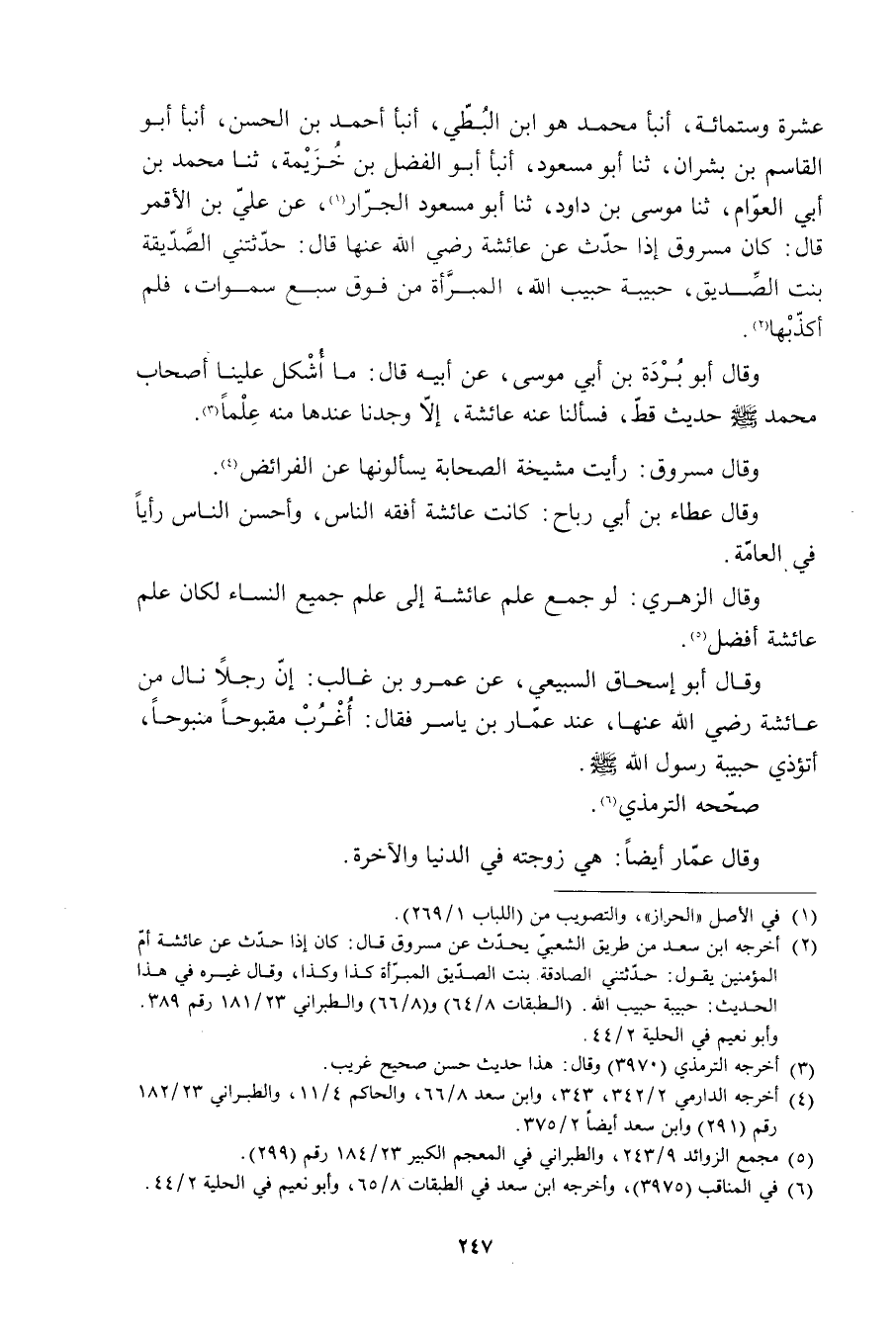 [2] أخرجه ابن سعد من طريق الشعبيّ يحدّث عن مسروق قال: كان إذا حدّث عن عائشة أمّ المؤمنين يقول: حدّثتني الصادقة بنت الصدّيق المبرّأة كذا وكذا، وقال غيره في هذا الحديث: حبيبة حبيب الله. (الطبقات 8/ 64) و (8/ 66) والطبراني 23/ 181 رقم 389.