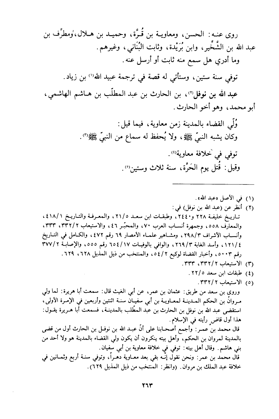 وروى بن سعد من طريق: عثمان بن عمر، عن أبي الغيث قال: سمعت أبا هريرة: لما ولي مروان بن الحكم المدينة لمعاوية بن أبي سفيان سنة اثنتين وأربعين في الإمرة الأولى، استقضى عبد الله بن نوفل بن الحارث بن عبد المطّلب بالمدينة، فسمعت أبا هريرة يقول: