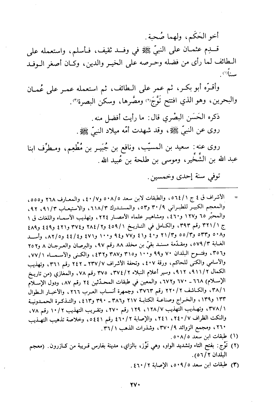 [ () ] الأشراف ق 4 ج 1/ 564، والطبقات لابن سعد 5/ 508 و 7/ 40، والمعارف 268 و 555، والمعجم الكبير للطبراني 9/ 30 و 53، والمستدرك 3/ 618، والاستيعاب 3/ 91، 92، والمحبّر 65 و 127 و 460، ومشاهير علماء الأمصار 224، وتهذيب الأسماء واللغات ق 1 ج 1/ 321 رقم 393، والكامل في التاريخ 1/ 459 و 2/ 284 و 374 و 421 و 449 و 489 و 508 و 533 و 3/ 55 و 3/ 21 و 40 و 41 و 77 و 94 و 100 و 471 و 4/ 44 و 5/ 82، وأسد الغابة 3/ 579، ومقدّمة مسند بقيّ بن مخلد 88 رقم 97، والبرصان والعرجان 8 و 252 و 356، وفتوح البلدان 70 و 99 و 100 و 315 و 387 و 432، والكنى والأسماء 1/ 77، والأسامي والكنى للحاكم، ورقة 407، وتحفة الأشراف 7/ 237- 242 رقم 361، وتهذيب الكمال 2/ 911، 912، وسير أعلام النبلاء 2/ 374، 375 رقم 78، والمغازي (من تاريخ الإسلام) 668- 670 و 672، والمعين في طبقات المحدّثين 24 رقم 87، ودول الإسلام 1/ 38، والكاشف 2/ 220 رقم 3763، وجمهرة أنساب العرب 266، والأخبار الطوال 133 و 139، والخراج وصناعة الكتابة 217 و 386- 390 و 413، والتذكرة الحمدونية 1/ 378، وتهذيب التهذيب 7/ 128، 129 رقم 270، وتقريب التهذيب 2/ 10 رقم 78، والنكت الظراف 7/ 240، 241، والإصابة 2/ 460 رقم 5441، وخلاصة تذهيب التهذيب 260، ومجمع الزوائد 9/ 370، وشذرات الذهب 1/ 36.