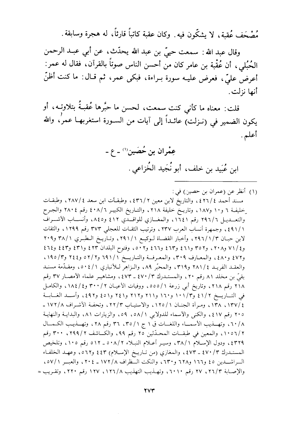 مُصْحَف عُقبة، لَا يشكون فِيهِ. وَكَانَ عقبة كاتبًا قارئًا، لَهُ هجرة وسابقة.