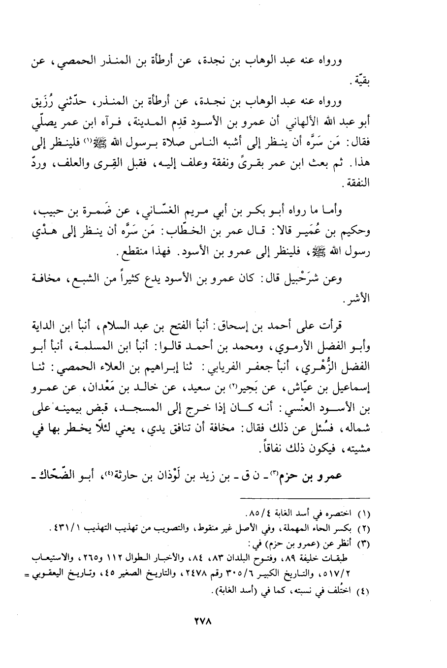 ورواه عَنْهُ عَبْد الْوَهاب بن نجدة، عَن أرطأة بن المنذر، حدثني رُزيق أَبُو عَبْد اللَّهِ الألهاني أن عمرو بن الأسود قدم المدينة، فرآه ابن عمر يصلي فقال: من سره أن ينظر إلى أشبه الناس صلاة برسول الله صلى الله عليه وآله وَسَلَّمَ [1] فلينظر إِلَى هَذَا. ثُمَّ بَعَثَ ابن عمر بقرًى ونفقة وعلف إليه، فقبل القِرى والعلف، وردّ النفقة.