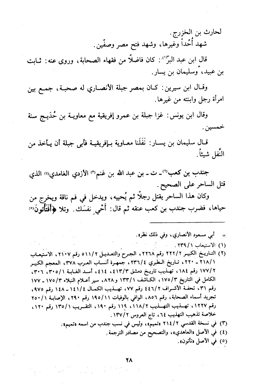 جندب بن كعب [2]- ت- بن عَبْدِ اللَّهِ بْنِ غَنَمٍ [3] الْأَزْدِيُّ الْغَامِدِيُّ [4] الَّذِي قَتَلَ السَّاحِرَ عَلَى الصَّحِيحِ.