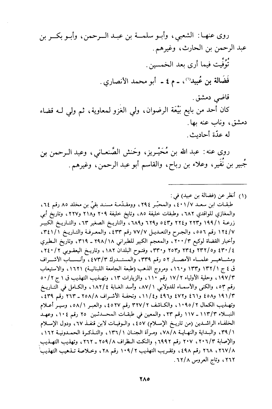 طبقات ابن سعد 7/ 401، والمحبّر 294، ومقدّمة مسند بقيّ بن مخلد 85 رقم 64، والمغازي للواقدي 682، وطبقات خليفة 85، وتاريخ خليفة 209 و 218 و 227، وتاريخ أبي زرعة 1/ 199 و 223 و 224 و 543 و 629 و 689، والتاريخ الصغير 63، والتاريخ الكبير 7/ 124 رقم 556، والجرح والتعديل 7/ 77 رقم 433، والمعرفة والتاريخ 1/ 341، وأخبار القضاة لوكيع 3/ 200، والمعجم الكبير للطبراني 18/ 298- 319، وتاريخ الطبري 4/ 430 و 5/ 232 و 234 و 253 و 330، وفتوح البلدان 182، وتاريخ اليعقوبي 2/ 240، ومشاهير علماء الأمصار 52 رقم 339، والمستدرك 3/ 473، وأنساب الأشراف ق 4 ج 1/ 132، 133 و 160، ومروج الذهب (طبعة الجامعة اللبنانية) 1621، والاستيعاب 3/ 197، وحلية الأولياء 2/ 17 رقم 110، والزيارات 13، وتهذيب التهذيب ق 1 ج 2/ 50 رقم 53، والكنى والأسماء للدولابي 1/ 87، وأسد الغابة 4/ 182، والكامل في التاريخ 3/ 191 و 458 و 461 و 472 و 496 و 4/ 11، وتحفة الأشراف 8/ 258- 263 رقم 439، وتهذيب الكمال 2/ 1095، والكاشف 2/ 327 رقم 4527، والعبر 1/ 58، وسير أعلام النبلاء 3/ 113- 117 رقم 23، والمعين في طبقات المحدثين 25 رقم 104، وعهد الخلفاء الراشدين (من تاريخ الإسلام) 457، والوفيات لابن قنفذ 67، ودول الإسلام 1/ 39، والبداية والنهاية 8/ 78، ومرآة الجنان 1/ 136، والتذكرة الحمدونية 162، والإصابة 3/ 206، 207 رقم 6992، والنكت الظراف 8/ 259- 262، وتهذيب التهذيب 8/ 267، 268 رقم 498، وتقريب التهذيب 2/ 109 رقم 28، وخلاصة تذهيب التهذيب 262، وتاج العروس 8/ 62.