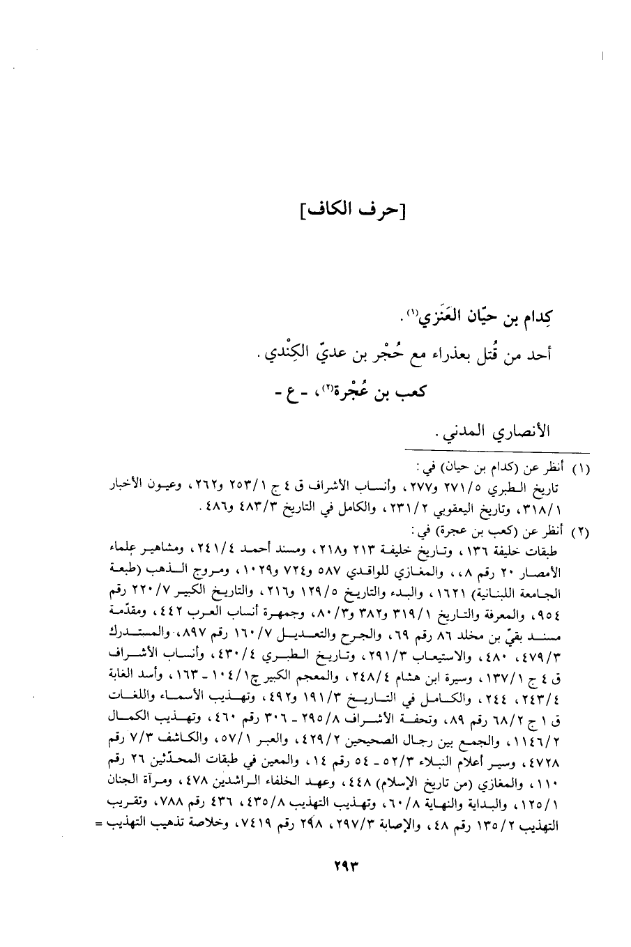 طبقات خليفة 136، وتاريخ خليفة 213 و 218، ومسند أحمد 4/ 241، ومشاهير علماء الأمصار 20 رقم 8، والمغازي للواقدي 587 و 724 و 1029، ومروج الذهب (طبعة الجامعة اللبنانية) 1621، والبدء والتاريخ 5/ 129 و 216، والتاريخ الكبير 7/ 220 رقم 954، والمعرفة والتاريخ 1/ 319 و 382 و 3/ 80، وجمهرة أنساب العرب 442، ومقدّمة مسند بقيّ بن مخلد 86 رقم 69، والجرح والتعديل 7/ 160 رقم 897، والمستدرك 3/ 479، 480، والاستيعاب 3/ 291، وتاريخ الطبري 4/ 430، وأنساب الأشراف ق 4 ج 1/ 137، وسيرة ابن هشام 4/ 248، والمعجم الكبير چ 1/ 104- 163، وأسد الغابة 4/ 243، 244، والكامل في التاريخ 3/ 191 و 492، وتهذيب الأسماء واللغات ق 1 ج 2/ 68 رقم 89، وتحفة الأشراف 8/ 295- 306 رقم 460، وتهذيب الكمال 2/ 1146، والجمع بين رجال الصحيحين 2/ 429، والعبر 1/ 57، والكاشف 3/ 7 رقم 4728، وسير أعلام النبلاء 3/ 52- 54 رقم 14، والمعين في طبقات المحدّثين 26 رقم 110، والمغازي (من تاريخ الإسلام) 448، وعهد الخلفاء الراشدين 478، ومرآة الجنان 1/ 125، والبداية والنهاية 8/ 60، وتهذيب التهذيب 8/ 435، 436 رقم 788، وتقريب التهذيب 2/ 135 رقم 48، والإصابة 3/ 297، 298 رقم 7419، وخلاصة تذهيب التهذيب