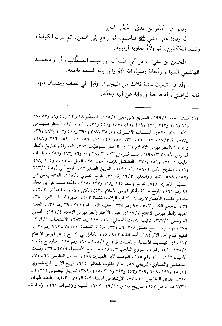 [1] مسند أحمد 1/ 199، التاريخ لابن معين 2/ 115، المحبّر 18 و 19 و 45 و 46 و 53 و 57 و 66 و 146 و 223 و 226 و 409 و 442 و 447 و 450 و 475، المعارف (انظر فهرس الأعلام 720) ، أنساب الأشراف 1/ 386 و 387 و 390 و 400 و 402 و 483 و 539 و 578، ق 3/ 17، 22، 26، 36، 45، 48، 51، 56، 58، 59، 296، و 298، ق 4 ج 1 (انظر فهرس الأعلام 636) ، الأخبار الموفقيّات 356، المعرفة والتاريخ (انظر فهرس الأعلام 3/ 498) ، نسب قريش 23 و 26 و 28 و 40 و 46 و 283 و 285، طبقات خليفة 5 و 126 و 189 و 230، الفضائل للإمام أحمد 25، العلل له 1/ 45 و 104 و 258 و 412، التاريخ الكبير 2/ 286 رقم 1491، التاريخ الصغير 52، تاريخ أبي زرعة 1/ 263 و 587، 588، الجرح والتعديل 3/ 19 رقم 72، تاريخ الطبري 5/ 158، المنتخب من ذيل المذيّل للطبري 548، تاريخ واسط 124 و 128 و 137 و 285، مقدّمة مسند بقيّ بن مخلد 94 رقم 161، تاريخ خليفة (انظر فهرس الأعلام 534) ، الكنى والأسماء للدولابي 2/ 52، مشاهير علماء الأمصار 7 رقم 6، كتاب الولاة والقضاة 203، جمهرة أنساب العرب 38، 39، المعجم الكبير 3/ 5- 97 رقم 235، حلية الأولياء 2/ 35- 39 رقم 132، العقد الفريد (انظر فهرس الأعلام 7/ 107) ، عيون الأخبار (انظر فهرس الأعلام 4/ 196) ، أمالي المرتضى 1/ 277، ترتيب الثقات للعجلي 116، 117 رقم 283، الاستيعاب 1/ 369- 378، تهذيب تاريخ دمشق 4/ 202- 231، صفة الصفوة 1/ 758- 762 رقم 120، تلقيح فهوم أهل الأثر 184، أسد الغابة 2/ 9- 15، الكامل في التاريخ (انظر فهرس الأعلام 13/ 95) ، تهذيب الأسماء واللغات ق 1 ج 1/ 158- 160 رقم 118، تاريخ بغداد 1/ 138- 141 رقم 2، مروج الذهب 3/ 181، جامع الأصول 9/ 27- 36، وفيات الأعيان 2/ 65- 69 رقم 155، الزهد لابن المبارك 258، رجال الطوسي 66- 71، المحاسن والمساوئ للبيهقي 55، ثمار القلوب للثعالبي 605، ربيع الأبرار للزمخشري 4/ 186 و 197 و 208 و 209 و 243 و 293 و 305 و 358 و 389، تاريخ اليعقوبي 2/ 212- 215، مقاتل الطالبيين 46- 77، الإرشاد في أسماء أئمة الهدى، للمفيد- طبعة طهران 1330 هـ. - ص 147، تاريخ دمشق 10/ 49- 202، التنبيه والإشراف 260، الإمامة