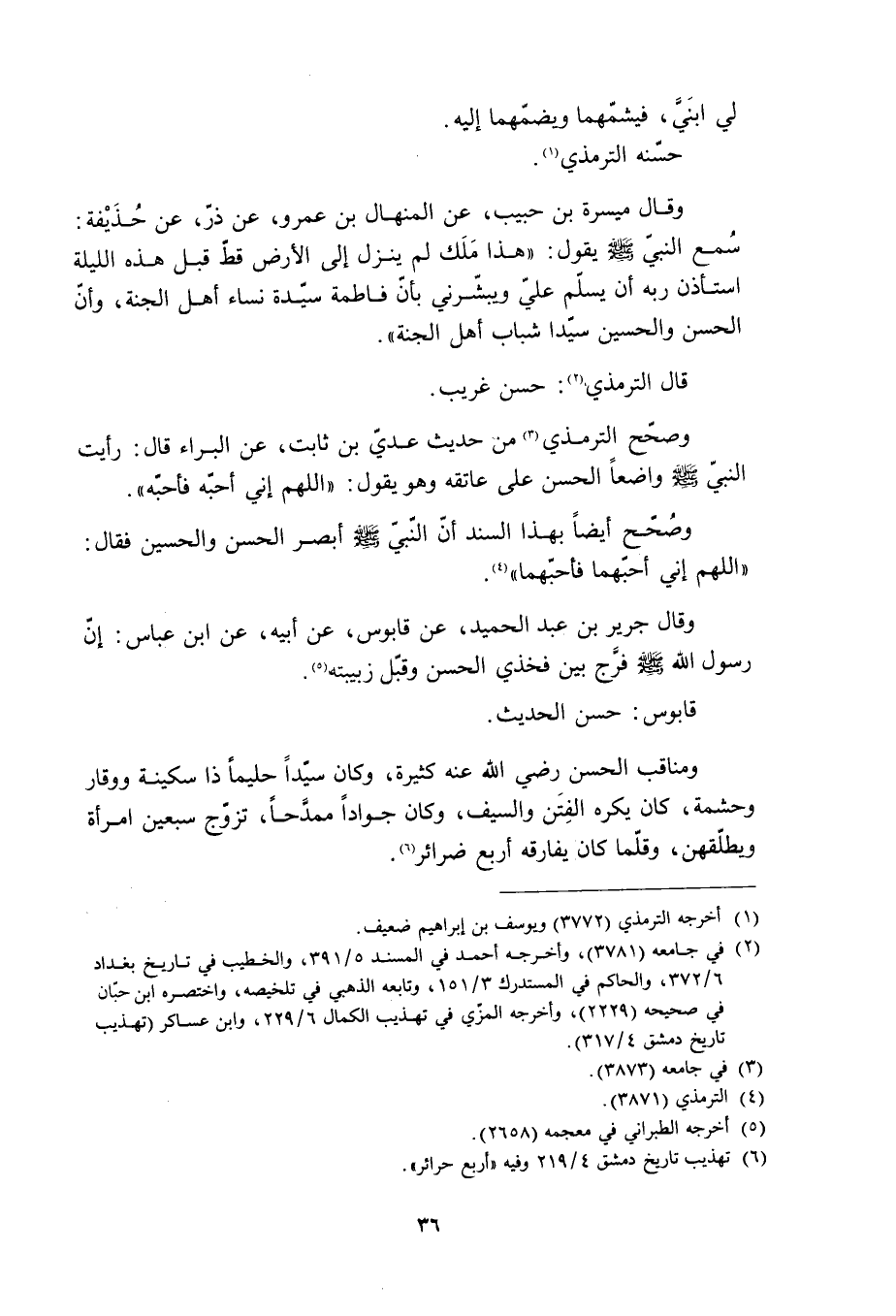 وَصَحَّحَ التِّرْمِذِيُّ [3] مِنْ حَدِيثِ عَدِيِّ بْنِ ثَابِتٍ، عَنِ الْبَرَاءِ قَالَ: رَأَيْتُ النَّبِيَّ صَلَّى اللَّهُ عَلَيْهِ وآله وَسَلَّمَ وَاضِعًا الْحَسَنَ عَلَى عَاتِقِهِ وَهُوَ يَقُولُ: «اللَّهمّ إِنِّي أُحِبُّهُ فَأَحِبَّهُ» . وصحح أيضا بهذا السند أنّ النّبيّ صلى الله عليه وآله وَسَلَّمَ أبصر الحسن والحسين فقال:
