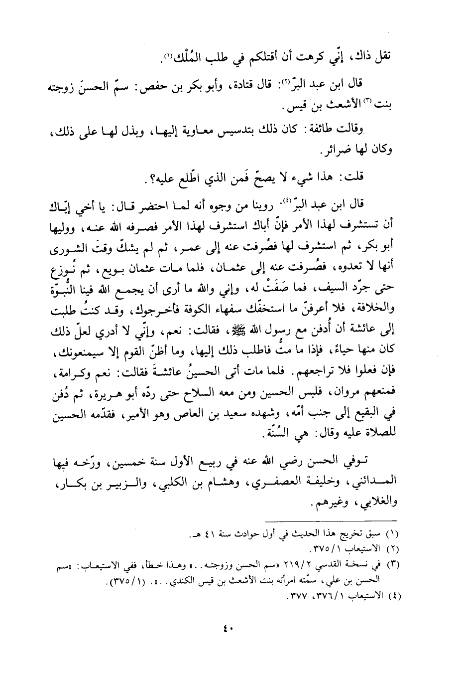 [3] في نسخة القدسي 2/ 219 «سم الحسن وزوجته..» وهذا خطأ، ففي الاستيعاب: «سم الحسن بن علي، سمّته امرأته بنت الأشعث بن قيس الكندي..» . (1/ 375) .