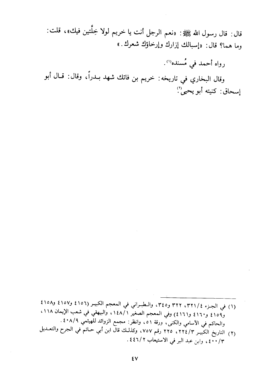 وَمَا هُمَا؟ قَالَ: «إِسْبَالُكَ إِزَارِكَ وَإِرْخَاؤُكَ شَعْرِكَ.» رَوَاهُ أَحْمَدُ فِي مُسْنَدِهِ [1] . وَقَالَ الْبُخَارِيُّ فِي تَارِيخِهِ: خُرَيْمُ بْنُ فَاتِكٍ شَهِدَ بَدْرًا، وَقَالَ: قَالَ أَبُو إِسْحَاقَ: كُنْيَتُهُ أبو يحيى [2] .