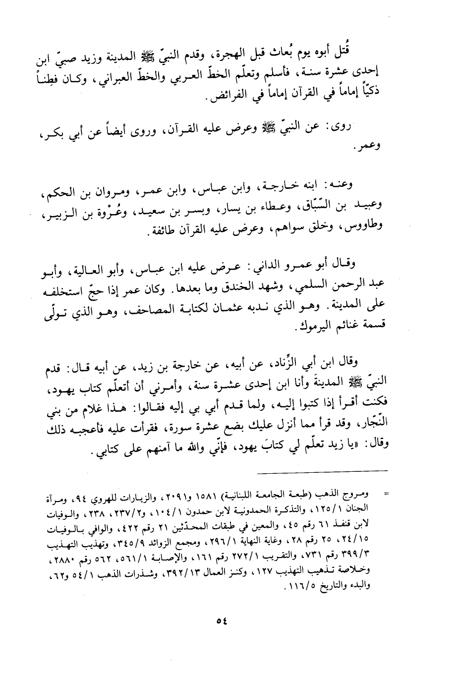 وَقَالَ ابْنُ أَبِي الزِّنَادِ، عَنْ أَبِيهِ، عَنْ خَارِجَةَ بْنِ زَيْدٍ، عَنْ أَبِيهِ قَالَ: قدم النبيّ صلى الله عليه وآله وَسَلَّمَ الْمَدِينَةَ وَأَنَا ابْنُ إِحْدَى عَشْرَةَ سَنَةٍ، وَأَمَرَنِي أَنْ أَتَعَلَّمَ كِتَابَ يَهُودٍ، فَكُنْتُ أَقْرَأُ إِذَا كَتَبُوا إِلَيْهِ، وَلَمَّا قَدِمَ أَبِي بِي إِلَيْهِ فَقَالُوا: هَذَا غُلَامٌ مِنْ بَنِي النَّجَّارِ، وَقَدْ قَرَأَ مِمَّا أُنْزِلَ عَلَيْكَ بِضْعَ عَشْرَةَ سُورَةٍ، فَقَرَأْتُ عَلَيْهِ فَأَعْجَبَهُ ذَلِكَ وَقَالَ: «يَا زَيْدٌ تَعَلَّمَ لِي كِتَابَ يَهُودٍ، فَإِنِّي وَاللَّهِ ما آمنهم على كتابي.
