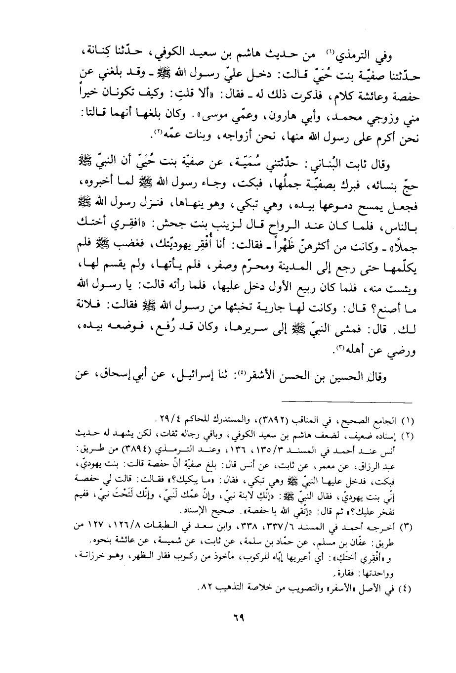 عبد الرزاق، عن معمر، عن ثابت، عن أنس قال: بلغ صفيّة أنّ حفصة قالت: بنت يهوديّ، فبكت، فدخل عليها النبيّ صلى الله عليه وآله وسلم وهي تبكي، فقال: «ما يبكيك؟» فقالت: قالت لي حفصة إنّي بنت يهوديّ، فقال النبيّ صلى الله عليه وآله وسلم: «إنّك لابنة نبيّ، وإنّ عمّك لنبيّ، وإنّك لتحت نبيّ، ففيم تفخر عليك؟» ثم قال: «اتّقي الله يا حفصة» . صحيح الإسناد.