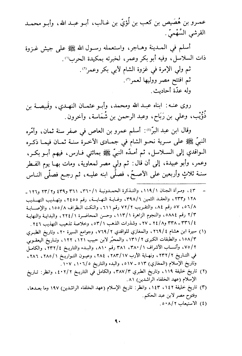 وَقَالَ ابْنُ عَبْدِ الْبَرِّ [4] : أَسْلَمَ عَمْرُو بْنُ الْعَاصِ فِي صَفَرٍ سَنَةَ ثَمَانٍ، وَأَمَّرَهُ النبيّ صلى الله عليه وآله وَسَلَّمَ عَلَى سَرِيَّةٍ نَحْوَ الشَّامِ فِي جُمَادَى الْآخِرَةِ سَنَةَ ثَمَانٍ فِيمَا ذَكَرَهُ الْوَاقِدِيُّ إِلَى السَّلَاسِلِ، ثُمَّ أَمَدَّهُ النَّبِيُّ صَلَّى اللَّهُ عَلَيْهِ وآله وَسَلَّمَ بِمِائَتَيْ فَارِسٍ، فِيهِمْ أَبُو بَكْرٍ، وَعُمَرُ، وَأَبُو عُبَيْدَةَ، إِلَى أَنْ قَالَ: ثُمَّ وَلِيَ مِصْرَ لِمُعَاوِيَةَ، وَمَاتَ بِهَا يَوْمَ الْفِطْرِ سَنَةَ ثَلَاثٍ وَأَرْبَعِينَ عَلَى الْأَصَحِّ، فَصَلَّى ابْنُهُ عَلَيْهِ، ثم رجع فصلّى الناس