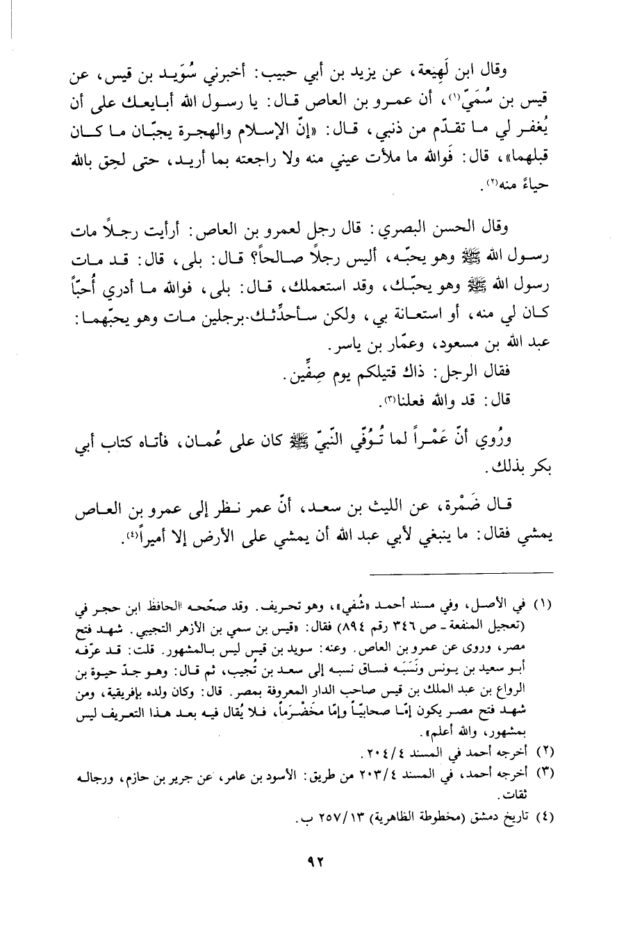 وَقَالَ الْحَسَنُ الْبَصْرِيُّ: قَالَ رَجُلٌ لِعَمْرِو بْنِ الْعَاصِ: أَرَأَيْتَ رَجُلًا مَاتَ رَسُولُ اللَّهِ صَلَّى اللَّهُ عليه وآله وَسَلَّمَ وَهُوَ يُحِبُّهُ، أَلَيْسَ رَجُلًا صَالِحًا؟ قَالَ: بَلَى، قَالَ: قَدْ مَاتَ رَسُولُ اللَّهِ صَلَّى الله عليه وآله وَسَلَّمَ وَهُوَ يُحِبُّكَ، وَقَدِ اسْتَعْمَلَكَ، قَالَ: بَلَى، فو الله مَا أَدْرِي أَحُبًّا كَانَ لِي مِنْهُ، أَوِ اسْتِعَانَةً بِي، وَلَكِنْ سَأُحَدِّثُكَ، بِرَجُلَيْنِ مَاتَ وَهُوَ يُحِبُّهُمَا: