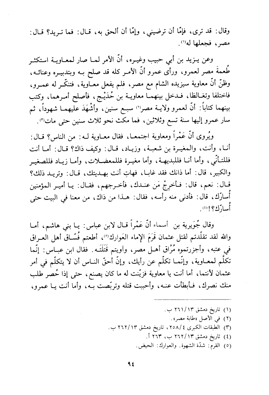 وَعَن يَزِيدَ بْنِ أَبِي حَبِيبٍ وَغَيْرِهِ، أَنَّ الْأَمْرَ لَمَّا صَارَ لِمُعَاوِيَةَ اسْتَكْثَرَ طُعْمَةَ مِصْرَ لِعَمْرٍو، وَرَأَى عَمْرٌو أَنَّ الْأَمْرَ كُلَّهُ قَدْ صَلُحَ بِهِ وَبِتَدْبِيرِهِ وَعَنَائِهِ، وَظَنَّ أَنَّ مُعَاوِيَةَ سَيَزِيدُهُ الشَّامَ مَعَ مِصْرَ، فَلَمْ يَفْعَلْ مُعَاوِيَةُ، فَتَنَكَّرَ لَهُ عَمْرٌو، فَاخْتَلَفَا وَتَغَالَظَا، فَدَخَلَ بَيْنَهُمَا مُعَاوِيَةُ بْنُ حُديْجٍ، فَأَصْلَحَ أَمْرَهُمَا، وَكَتَبَ بَيْنَهُمَا كِتَابًا: أَنَّ لِعَمْرٍو وِلَايَةَ مِصْرَ [2] سَبْعَ سِنِينَ، وَأَشْهَدَ عَلَيْهِمَا شُهُودًا، ثُمَّ سَارَ عَمْرٌو إِلَيْهَا سَنَةَ تِسْعٍ وَثَلَاثِينَ، فَمَا مَكَثَ نَحْوَ ثَلَاثَ سِنِينَ حَتَّى مَاتَ [3] .