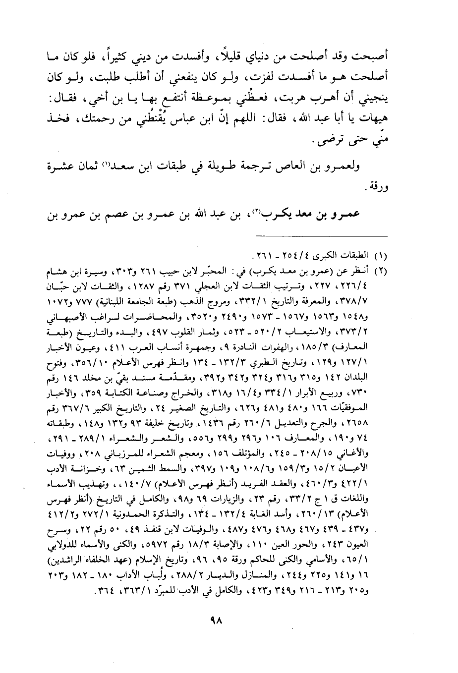 وَلِعَمْرِو بْنِ الْعَاصِ تَرْجَمَةٌ طَوِيلَةٌ فِي طَبَقَاتِ ابْنِ سعد [1] ثمان عشرة ورقة.