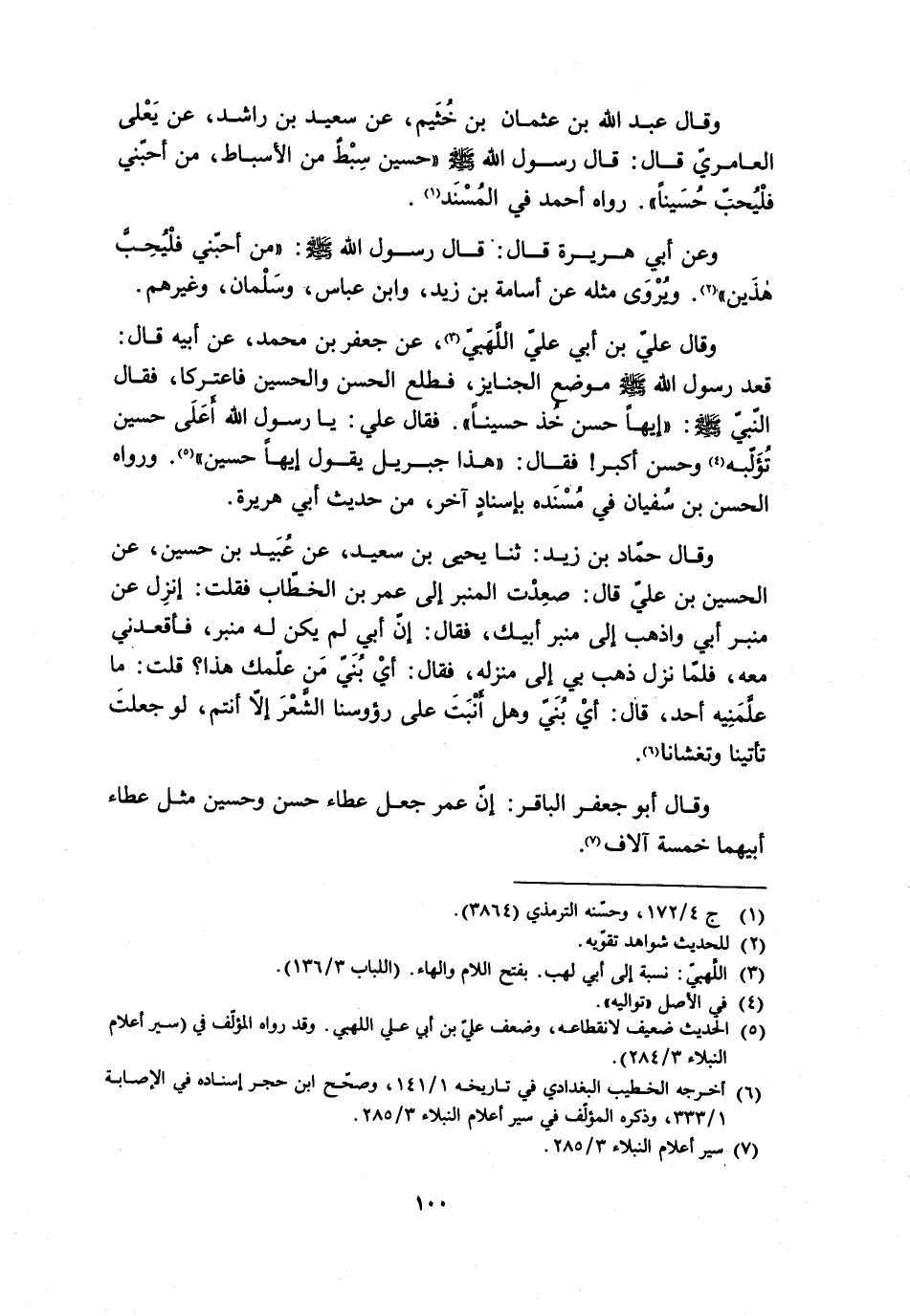 وَقَالَ عَبْدِ اللَّهِ بْنِ عُثْمَانَ بْنِ خُثَيْمٍ، عَنْ سَعِيدِ بْنِ رَاشِدٍ، عَنْ يَعْلَى الْعَامِرِيِّ قَالَ: قَالَ رَسُولُ اللَّهِ صَلَّى اللَّهُ عَلَيْهِ وَسَلَّمَ «حُسَيْنٌ سِبْطٌ مِنَ الأَسَبَاطِ، مَنْ أَحَبَّنِي فَلْيُحِبَّ حُسَيْنًا» . رَوَاهُ أَحْمَدُ فِي الْمُسْنَدِ [1] . وَعَنْ أَبِي هُرَيْرَةَ قَالَ: قَالَ رَسُولُ اللَّهِ صَلَّى اللَّهُ عَلَيْهِ وَسَلَّمَ: «مَنْ أَحَبَّنِي فَلْيُحِبَّ هَذَيْنِ» [2] . وَيُرْوَى مِثْلُهُ عَنْ أُسَامَةَ بْنِ زَيْدٍ، وَابْنِ عَبَّاسٍ، وَسَلْمَانَ، وَغَيْرِهِمْ.