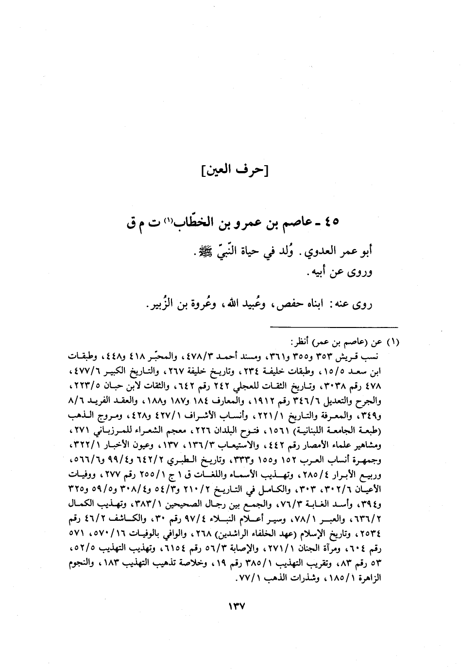 45- عَاصِمُ بْنُ عَمْرِو بْنِ الْخَطَّابِ [1] ت م ق أبو عمر العدوي. وُلِدَ فِي حَيَاةِ النَّبِيِّ صَلَّى اللَّهُ عَلَيْهِ وَسَلَّمَ.