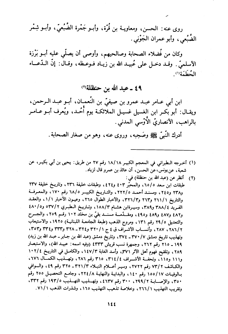 49- عَبْدُ اللَّهِ بْنُ حَنْظَلَةَ [2] ابْنِ أَبِي عَامِرٍ عَبْدُ عَمْرِو بْنِ صَيْفِيِّ بْنِ النُّعْمَانِ، أَبُو عَبْدِ الرَّحْمَنِ، وَيُقَالُ: أبو بكر ابن الْغَسِيلِ غَسِيلُ الْمَلائِكَةِ يَوْمَ أُحُدٍ، وَيُعْرَفُ أَبُو عَامِرٍ بِالرَّاهِبِ، الأَنْصَارِيُّ الأَوْسِيُّ الْمَدَنِيُّ.