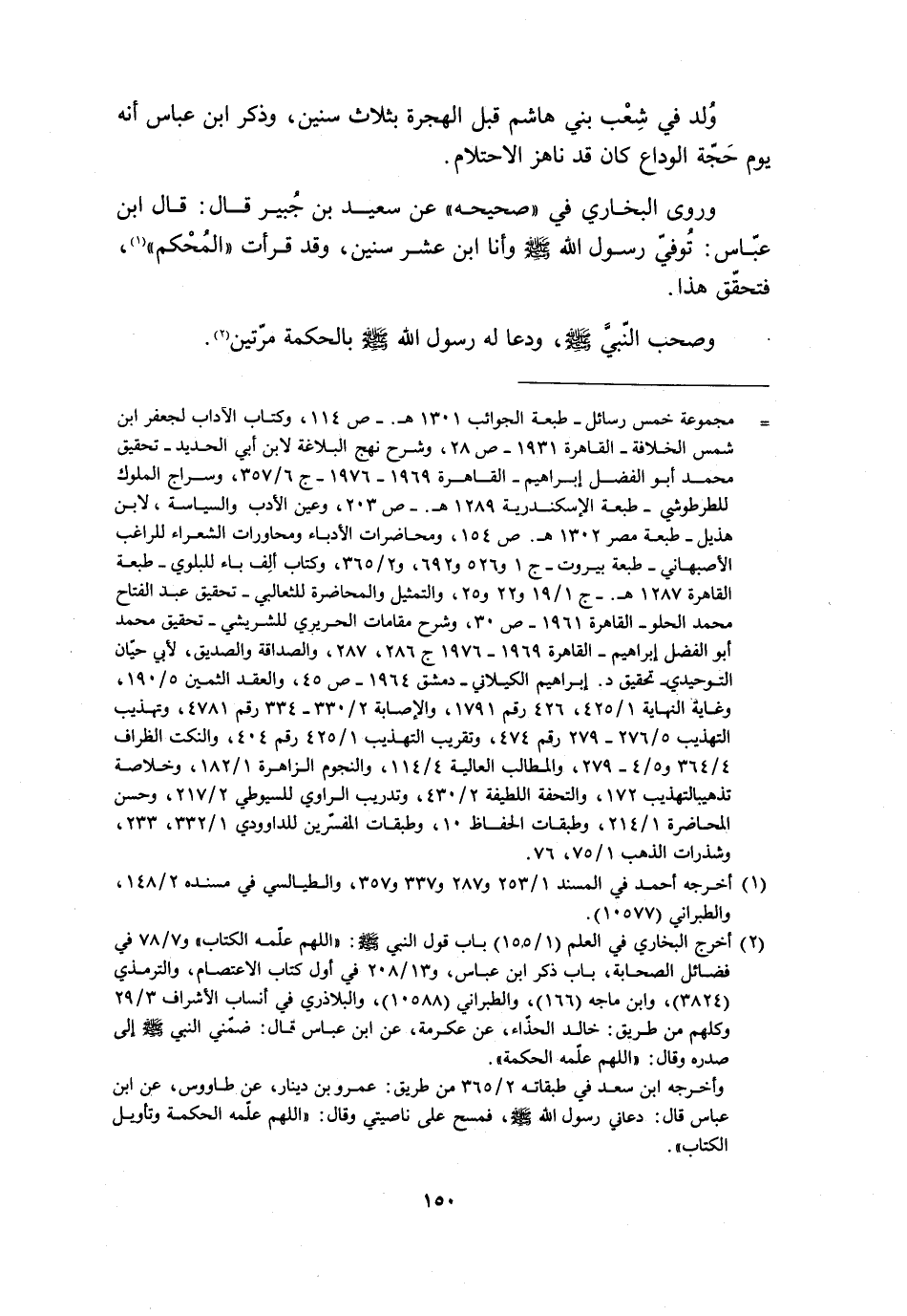 [2] أخرج البخاري في العلم (1/ 155) باب قول النبي صلّى الله عليه وسلّم: «اللَّهمّ علّمه الكتاب» و 7/ 78 في فضائل الصحابة، باب ذكر ابن عباس، و 13/ 208 في أول كتاب الاعتصام، والترمذي (3824) ، وابن ماجة (166) ، والطبراني (10588) ، والبلاذري في أنساب الأشراف 3/ 29 وكلهم من طريق: خالد الحذّاء، عن عكرمة، عن ابن عباس قال: ضمّني النبي صلّى الله عليه وسلّم 7 لي صدره وقال: «اللَّهمّ علّمه الحكمة» . وأخرجه ابن سعد في طبقاته 2/ 365 من طريق: عمرو بن دينار، عن طاووس، عن ابن عباس قال: دعاني رسول الله صلّى الله عليه وسلّم، فمسح على ناصيتي وقال: «اللَّهمّ علّمه الحكمة وتأويل الكتاب» .