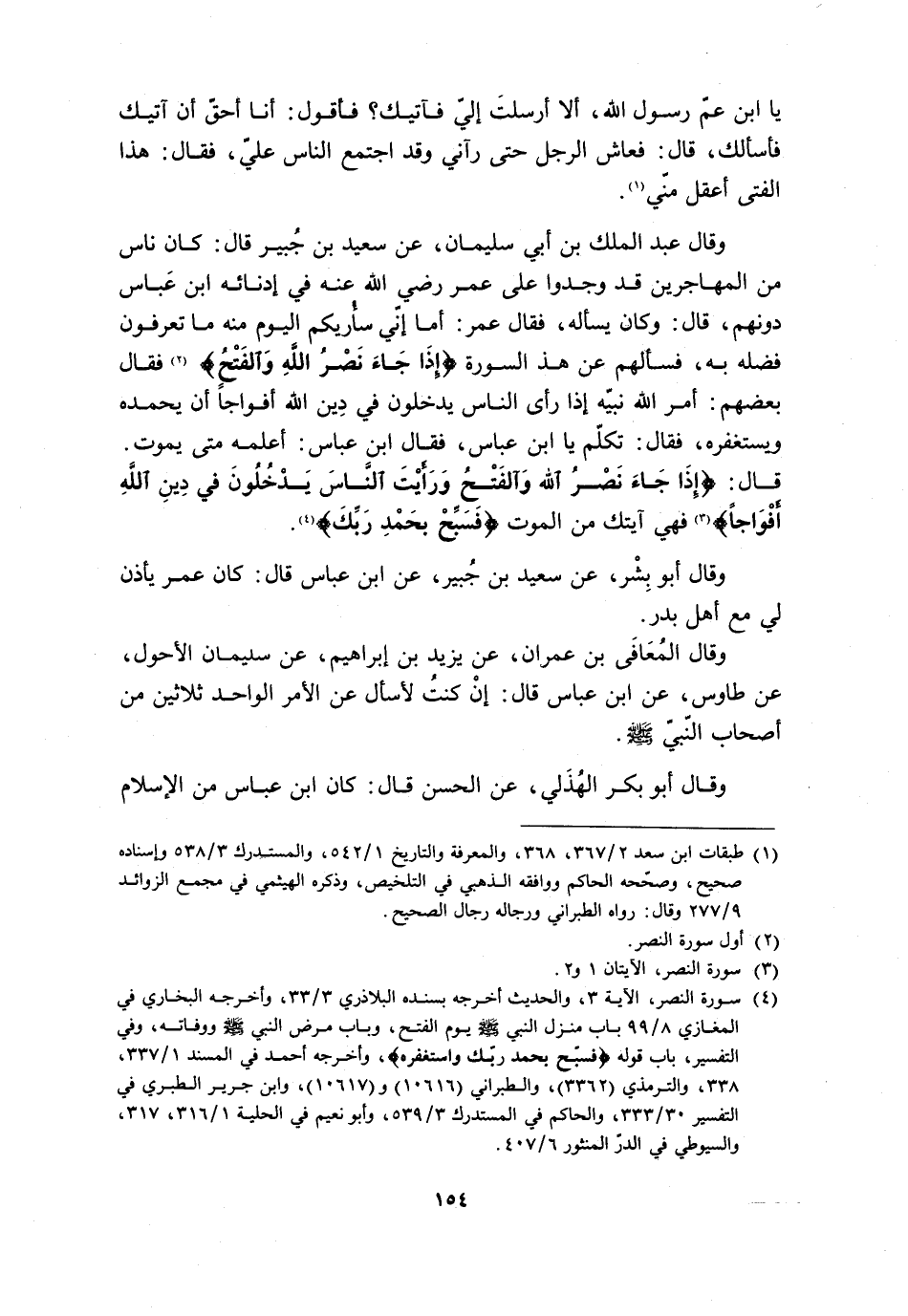 [4] سورة النصر، الآية 3، والحديث أخرجه بسنده البلاذري 3/ 33، وأخرجه البخاري في المغازي 8/ 99 باب منزل النبي صلى الله عليه وسلم يوم الفتح، وباب مرض النبي صلّى الله عليه وسلّم ووفاته، وفي التفسير، باب قوله فَسَبِّحْ بِحَمْدِ رَبِّكَ وَاسْتَغْفِرْهُ 110: 3، وأخرجه أحمد في المسند 1/ 337، 338، والترمذي (3362) ، والطبراني (10616) و (10617) ، وابن جرير الطبري في التفسير 30/ 333، والحاكم في المستدرك 3/ 539، وأبو نعيم في الحلية 1/ 316، 317، والسيوطي في الدرّ المنثور 6/ 407.