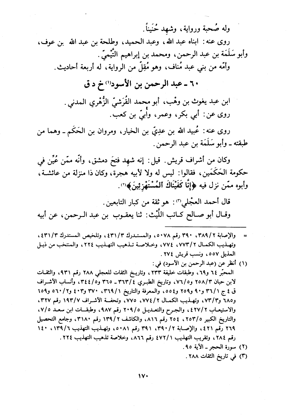 [ () ] والإصابة 2/ 389، 390 رقم 5078، والمستدرك 3/ 431، وتلخيص المستدرك 3/ 431، وتهذيب الكمال 2/ 773، 774، وخلاصة تذهيب التهذيب 224، والمنتخب من ذيل المذيل 557، ونسب قريش 274.