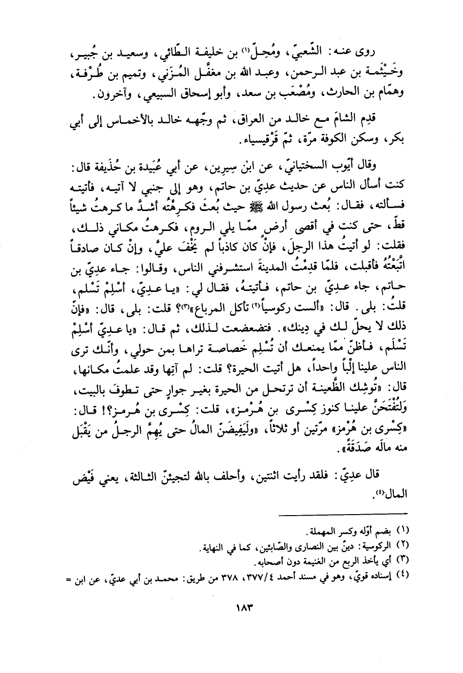 كُنْتُ أَسْأَلُ النَّاسَ عَنْ حَدِيثِ عَدِيِّ بْنِ حَاتِمٍ، وَهُوَ إِلَى جَنْبِي لا آتِيهِ، فَأَتَيْتُهُ فَسَأَلْتُهُ، فَقَالَ: بُعِثَ رَسُولُ اللَّهِ صَلَّى اللَّهُ عَلَيْهِ وَسَلَّمَ حَيْثُ بُعِثَ فَكَرِهْتُهُ أَشَدَّ مَا كَرِهْتُ شَيْئًا قَطُّ، حَتَّى كُنْتُ فِي أَقْصَى أَرْضٍ مِمَّا يَلِي الرُّومَ، فَكَرِهْتُ مَكَانِي ذَلِكَ، فَقُلْتُ: لَوْ أَتَيْتُ هَذَا الرَّجُلَ، فَإِنْ كَانَ كَاذِبًا لَمْ يَخْفَ عَلَيَّ، وَإنْ كَانَ صَادِقًا اتَّبَعْتُهُ فَأَقْبَلْتُ، فَلَمَّا قَدِمْتُ الْمَدِينَةَ اسْتَشْرَفَنِي النَّاسُ، وَقَالُوا: جَاءَ عَدِيُّ بْنُ حَاتِمٍ، جَاءَ عَدِيُّ بْنُ حَاتِمٍ، فَأَتَيْتُهُ، فَقَالَ لِي: «يَا عَدِيُّ، أَسْلِمْ تَسْلَمْ، قُلْتُ: بَلَى. قَالَ: «أَلَسْتَ رُكُوسِيًّا [2] تَأْكُلُ الْمِرْبَاعَ؟» [3] ؟ قُلْتُ: بَلَى، قَالَ: «فَإِنَّ ذَلِكَ لا يَحِلُّ لَكَ فِي دِينِكَ» . فَتَضَعْضَعْتُ لِذَلِكَ، ثُمَّ قَالَ: «يَا عَدِيُّ أسْلِمْ تَسْلَمْ، فَأَظُنُّ مِمَّا يَمْنَعُكَ أَنْ تُسْلِمَ خَصَاصَةٌ تَرَاهَا بِمَنْ حَوْلِي، وَأَنَّكَ تَرَى النَّاسَ عَلَيْنَا إِلْبًا وَاحِدًا، هَلْ أَتَيْتَ الْحِيرَةَ؟ قُلْتُ: لَمْ آتِهَا وَقَدْ عَلِمْتُ مَكَانَهَا، قَالَ: «تُوشِكُ الظَّعِينَةُ أَنْ تَرْتَحِلَ مِنَ الْحِيرَةِ بِغَيْرِ جَوَارٍ حَتَّى تَطُوفَ بِالْبَيْتِ، وَلَتُفْتَحَنَّ عَلَيْنَا كُنُوزُ كِسْرَى بْنِ هُرْمُزَ» ، قُلْتُ: كِسْرى بْنُ هُرْمُزَ؟! قَالَ: