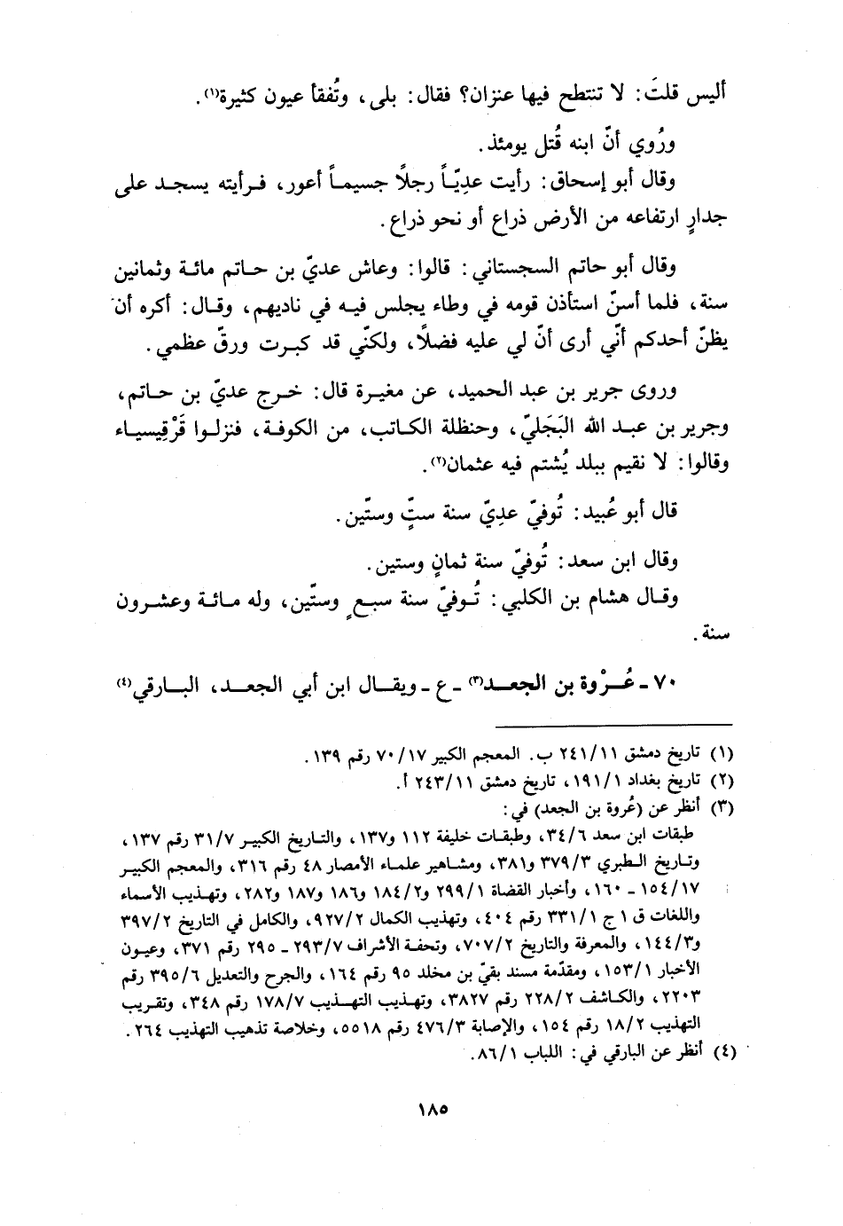 وَرَوَى جَرِيرُ بْنُ عَبْدِ الْحَمِيدِ، عَنْ مُغِيرَةَ قَالَ: خَرَجَ عَدِيُّ بْنُ حَاتِمٍ، وَجَرِيرُ بْنُ عَبْدِ اللَّهِ الْبَجَلِيُّ، وَحْنَظَلَةُ الْكَاتِبُ، مِنَ الْكُوفَةِ، فَنَزَلُوا قَرْقِيسِيَاءَ وَقَالُوا: لا نُقِيمُ بِبَلَدٍ يُشْتَمُ فِيهِ عُثْمَانُ [2] .
