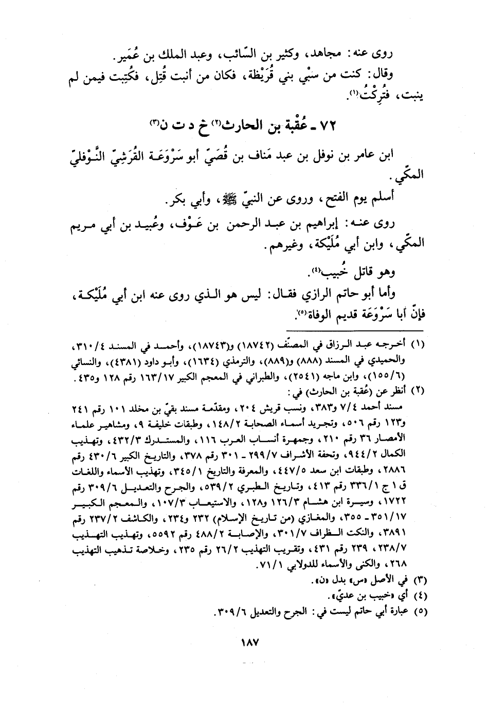 72- عُقْبَةُ بْنُ الْحَارِثِ [2] خ د ت ن [3] ابن عَامِرِ بْنِ نَوْفَلِ بْنِ عَبْدِ مَنَافِ بْنِ قصيّ أبو سروعة القرشيّ النّوفليّ المكّي.