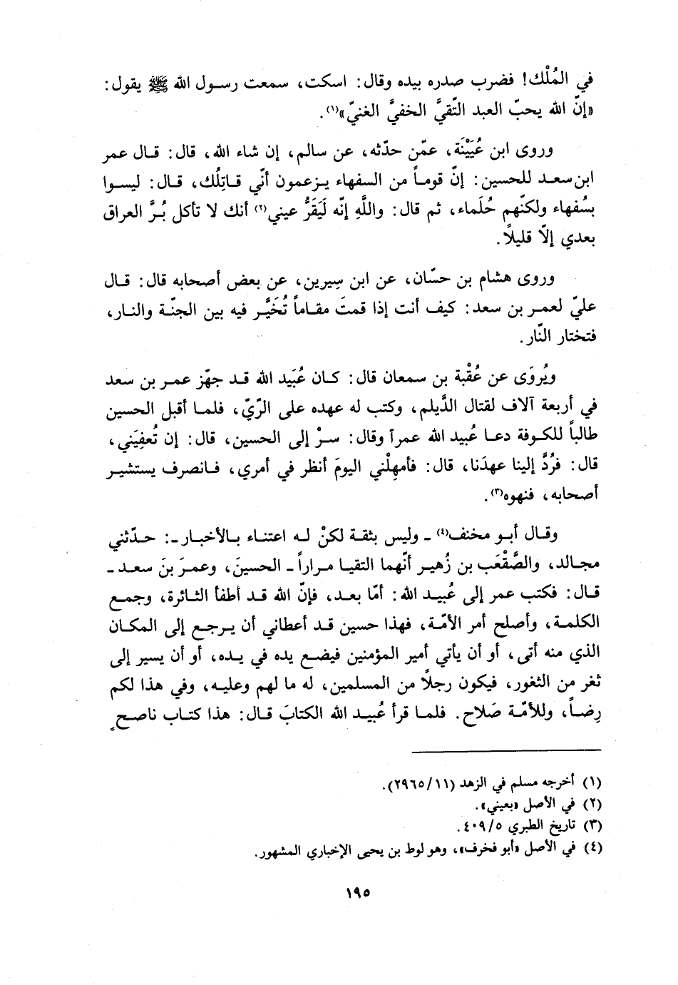 وَقَالَ أَبُو مِخْنَفٍ [4]- وَلَيْسَ بِثِقَةٍ لَكِنْ لَهُ اعْتِنَاءٌ بِالأَخْبَارِ-: حَدَّثَنِي مُجَالِدٌ، وَالصَّقْعَبُ بْنُ زُهَيْرٍ أَنَّهُمَا الْتَقَيَا مِرَارًا- الْحُسَيْنَ، وَعُمَرَ بْنَ سَعْدٍ- قَالَ: فَكَتَبَ عُمَرُ إِلَى عُبَيْدِ اللَّهِ: أَمَّا بَعْدُ، فَإِنَّ اللَّهَ قَدْ أَطْفَأَ الثَّائِرَةَ، وَجَمَعَ الْكَلِمَةَ، وَأَصْلَحَ أَمْرَ الأُمَّةِ، فَهَذَا حُسَيْنٌ قَدْ أَعْطَانِي أَنْ يَرْجِعَ إِلَى الْمَكَانِ الَّذِي مِنْهُ أَتَى، أَوْ أَنْ يَأْتِيَ أَمِيرَ الْمُؤْمِنِينَ فَيَضَعُ يَدَهُ فِي يَدِهِ، أَوْ أَنْ يَسِيرَ إِلَى ثَغْرٍ مِنَ الثُّغُورِ، فَيَكُونُ رَجُلا مِنَ الْمُسْلِمِينَ، لَهُ مَا لَهْمُ وَعَلَيْهِ، وَفِي هَذَا لَكُمْ رِضًا، وَلِلأُمَّةِ صَلاحٌ. فَلَمَّا قَرَأَ عُبَيْدُ اللَّهِ الْكِتَابَ قَالَ: هذا كتاب ناصح