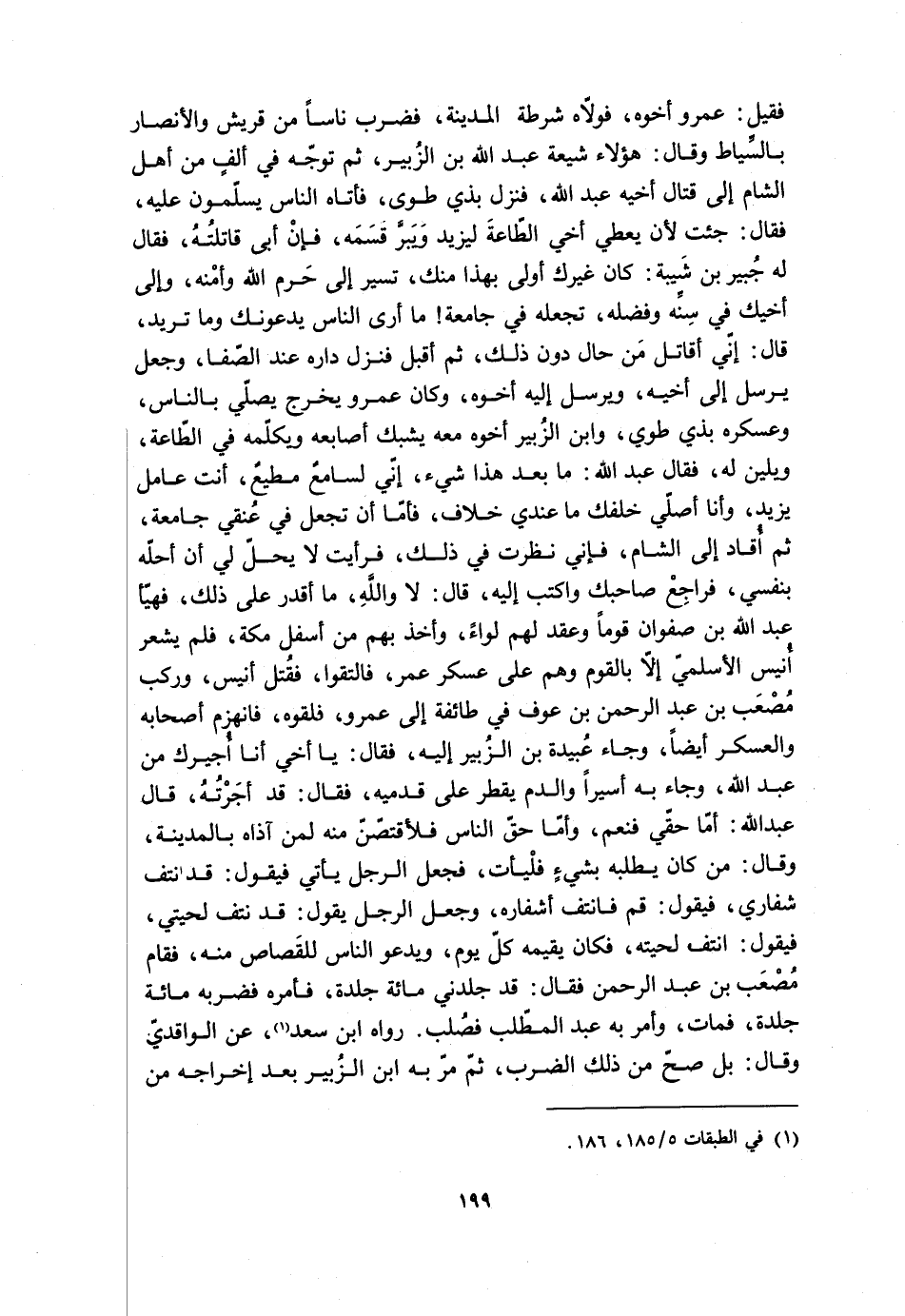 فَقِيلَ: عَمْرُو أَخُوهُ، فَوَلاهُ شُرْطَةَ الْمَدِينَةِ، فَضَرَبَ نَاسًا مِنْ قُرْيَشٍ وَالأَنْصَارِ بِالسِّيَاطِ وَقَالَ: هَؤُلاءِ شِيعَةُ عَبْدِ اللَّهِ بْنِ الزُّبَيْرِ، ثُمَّ تَوَجَّهَ فِي أَلْفٍ مِنْ أَهْلِ الشَّامِ إِلَى قِتَالِ أَخِيهِ عَبْدِ اللَّهِ، فَنَزَلَ بِذِي طُوَى، فَأَتَاهُ النَّاسُ يُسَلِّمُونَ عَلَيْهِ، فَقَالَ: جِئْتُ لِأَنْ يُعْطِيَ أَخِي الطَّاعَةَ لِيَزِيدَ وَيَبَرَّ قَسَمَهُ، فَإِنْ أَبَى قَاتَلْتُهُ، فَقَالَ لَهُ جُبَيْرُ بْنُ شَيْبَةَ: كَانَ غَيْرُكَ أَوْلَى بِهَذَا مِنْكَ، تَسِيرُ إِلَى حَرَمِ اللَّهِ وَأَمْنِهِ، وَإِلَى أَخِيكَ فِي سِنِّهِ وَفَضْلِهِ، تَجْعَلُهُ فِي جَامِعَةٍ! مَا أَرَى النَّاسَ يَدْعُونَكَ وَمَا تُرِيدُ، قَالَ: إِنِّي أُقَاتِلُ مَنْ حَالَ دُونَ ذَلِكَ، ثُمَّ أَقْبَلَ فَنَزَلَ دَارَهُ عِنْدَ الصَّفَا، وَجَعَلَ يُرْسِلُ إِلَى أَخِيهِ، وَيُرْسِلُ إِلَيْهِ أَخُوهُ، وَكَانَ عَمْرُو يَخْرُجُ يُصَلِّي بِالنَّاسِ، وَعَسْكَرَهُ بِذِي طُوَى، وَابْنُ الزُّبَيْرِ أَخُوهُ مَعَهُ يُشَبِّكُ أَصَابِعَهُ وَيُكَلِّمُهُ فِي الطَّاعَةِ، وَيَلِينُ لَهُ، فَقَالَ عَبْدُ اللَّهِ: مَا بَعْدَ هَذَا شَيْءٌ، إِنِّي لَسَامِعٌ مُطِيعٌ، أَنْتَ عَامِلُ يَزِيدَ، وَأَنَا أُصَلِّي خَلْفَكَ مَا عِنْدِي خِلَافٌ، فَأَمَّا أَنْ تَجْعَلَ فِي عُنُقِي جَامِعَةً، ثُمَّ أُقَادُ إِلَى الشَّامِ، فَإِنِّي نَظَرْتُ فِي ذَلِكَ، فَرَأَيْتُ لا يَحِلُّ لِي أَنْ أَحُلَّهُ بِنَفْسِي، فَرَاجِعْ صَاحِبَكَ وَاكْتُبْ إِلَيْهِ، قَالَ: لا وَاللَّهِ، مَا أَقْدِرُ عَلَى ذَلِكَ، فَهَيَّأَ عَبْدُ اللَّهِ بْنُ صَفْوَانَ قَوْمًا وَعَقَدَ لَهُمْ لِوَاءً، وَأَخَذَ بِهِمْ مِنْ أَسْفَلِ مكة، فلم يشعر أنيس الأسلميّ إِلا بِالْقَوْمِ وَهُمْ عَلَى عَسْكَرِ عُمَرَ، فَالْتَقَوْا، فَقُتِلَ أُنَيْسٌ، وَرَكِبَ مُصْعَبُ بْنُ عَبْدِ الرَّحْمَنِ بْنِ عَوْفٍ فِي طَائِفَةٍ إِلَى عَمْرِو، فَلَقَوْهُ، فَانْهَزَمَ أَصْحَابُهُ وَالْعَسْكَرُ أَيْضًا، وَجَاءَ عُبَيْدَةُ بْنُ الزُّبَيْرِ إِلَيْهِ، فَقَالَ: يَا أَخِي أَنَا أُجِيرُكَ مِنْ عَبْدِ اللَّهِ، وَجَاءَ بِهِ أَسِيرًا وَالدَّمُ يَقْطُرُ عَلَى قَدَمَيْهِ، فَقَالَ: قَدْ أَجَرْتُهُ، قَالَ عَبْدُ اللَّهِ: أَمَّا حَقِّي فَنَعَمْ، وَأمَّا حَقُّ النَّاسِ فَلأَقْتَصَّنَّ مِنْهُ لِمَنْ آذَاهُ بِالْمَدِينَةِ، وَقَالَ: مَنْ كَانَ يَطْلُبُهُ بِشَيْءٍ فَلْيَأْتِ، فَجَعَلَ الرَّجُلُ يَأْتِي فَيَقُولُ: قَدْ نَتَفَ شُفَارِيَ، فَيَقُولُ: قُمْ فانتف أشفاره، وجعل الرجل يقول: قَدْ نَتَفَ لِحْيَتِي، فَيَقُولُ: انْتِفْ لِحْيَتَهُ، فَكَانَ يُقِيمُهُ كُلَّ يَوْمٍ، وَيَدْعُو النَّاسَ لِلْقَصَاصِ مِنْهُ، فَقَامَ مُصْعَبُ بْنُ عَبْدِ الرَّحْمَنِ فَقَالَ: قَدْ جَلَدَنِي مِائَةَ جَلْدَةٍ، فَأَمَرَهُ فَضَرَبَهُ مِائَةَ جَلْدَةٍ، فَمَاتَ، وَأَمَرَ بِهِ عَبْدُ الْمُطَّلِبِ فَصُلِبَ. رَوَاهُ ابْنُ سَعْدٍ [1] ، عَنِ الْوَاقِدِيِّ وَقَالَ: بَلْ صَحَّ مِنْ ذَلِكَ الضَّرْبُ، ثُمَّ مَرَّ بِهِ ابْنُ الزبير بعد إخراجه من