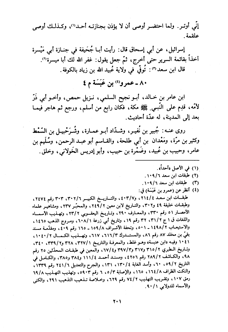 80- عمرو [4] بن عبسة م 4 ابْنِ عَامِرِ بْنِ خَالِدٍ، أَبُو نَجِيحٍ السُّلَمِيُّ، نزيل حِمْصَ، وَأَخُو أَبِي ذَرٍّ لأُمِّهِ، قدِم عَلَى النَّبِيِّ صَلَّى اللَّهُ عَلَيْهِ وَسَلَّمَ مَكَّةَ، فَكَانَ رَابِعَ مَنْ أَسْلَمَ، وَرَجَعَ ثُمَّ هَاجَرَ فِيمَا بَعْدُ إِلَى الْمَدِينَةِ، لَهُ عِدَّةُ أَحَادِيثَ.